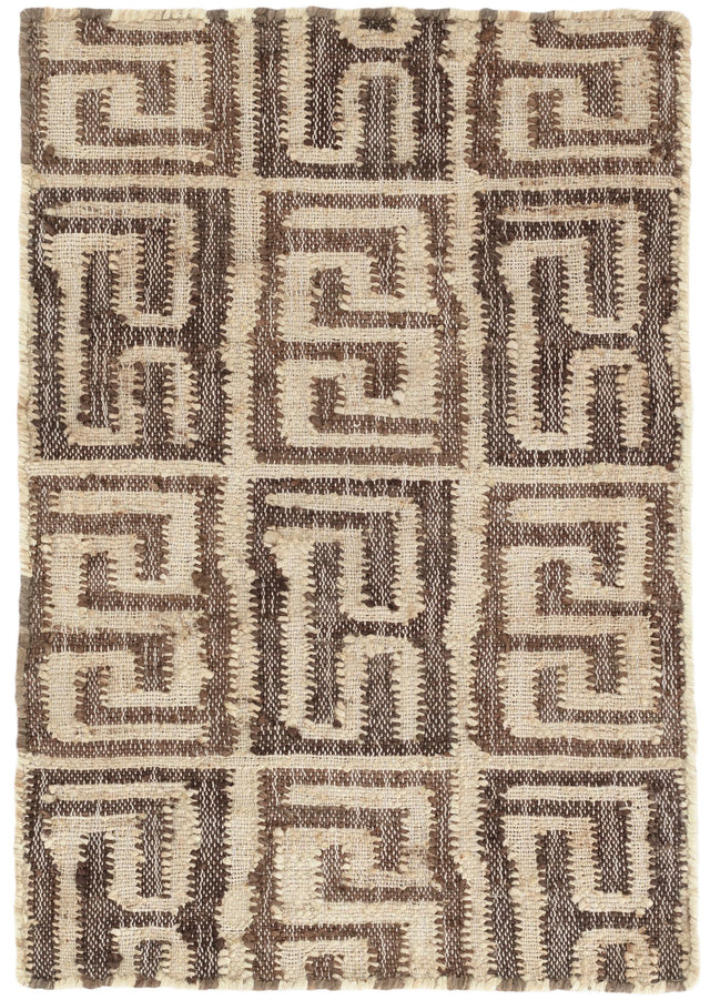 In her latest capsule collection, Annie's friend and collaborator Bunny Williams was inspired by the unique geometric Kuba weaving of central Africa. The sacred Kuba designs are mathematical and rhythmic in vegetable-dyed earth tones and evolved from a number of techniques featuring flat weaving and cut pile, with patchwork, embroidery, and appliqué. The Auricula dhurrie weave rug has a natural jute greek key-like motif woven onto alternating rectangles of brown and natural. Translated with hard working jute fiber, this modern and timeless rug is sophisticated and practical, especially for high traffic areas.