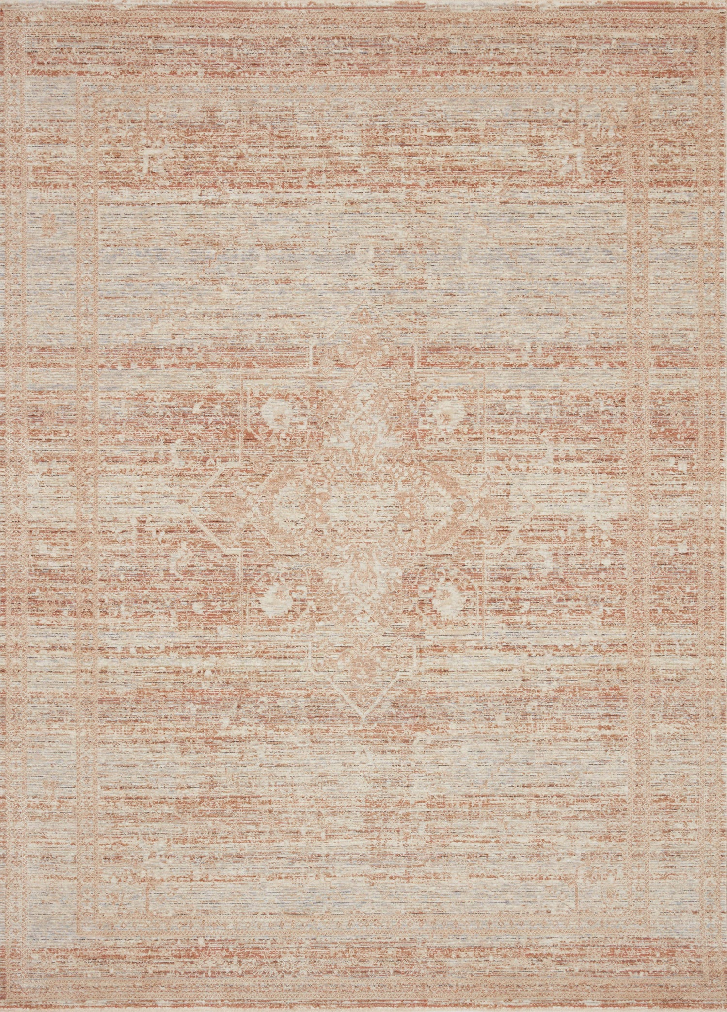 Power-loomed of polyester and viscose in Turkey, the Faye Collection displays a soft color palette and a mix of distressed and traditional-inspired motifs.
