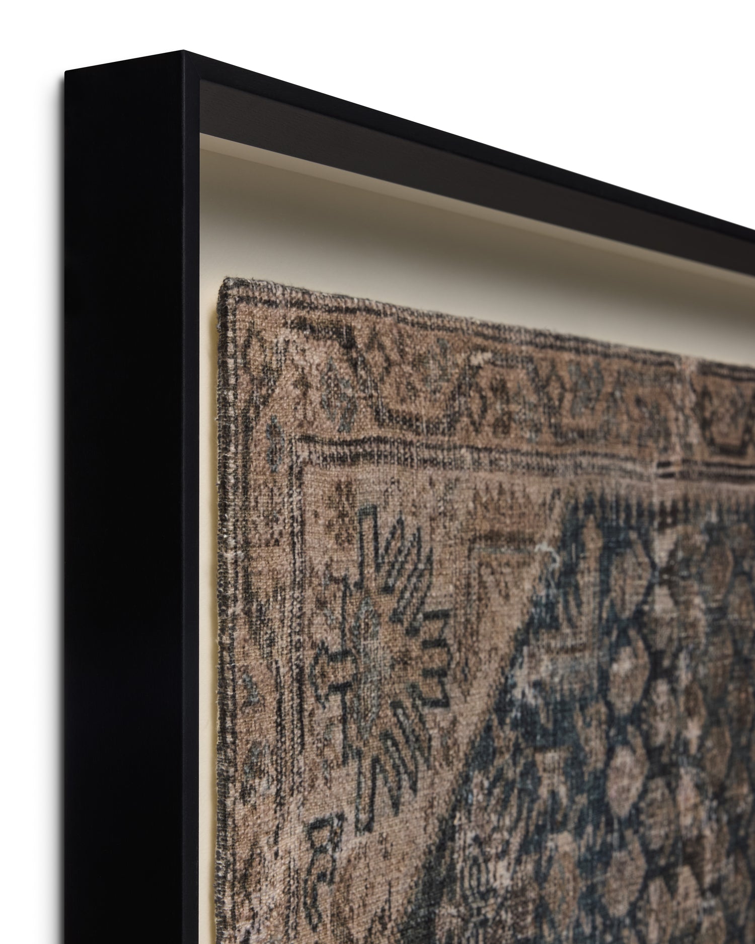 Pismo wall art from Amber Lewis x Loloi features a vintage-inspired printed textile with a deep, moody color palette, measuring 28” x 56”. The artwork is made in India and custom-framed in Dallas, Texas.