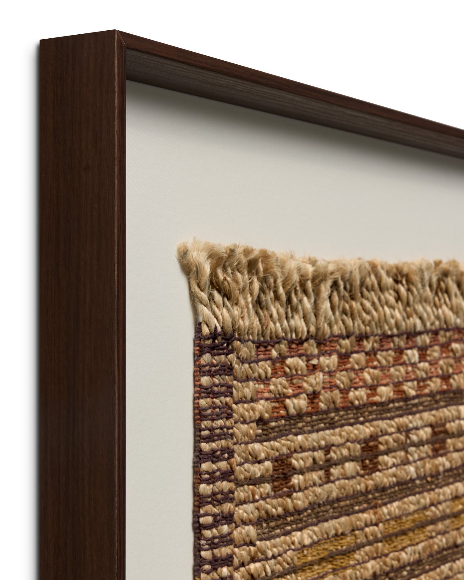 Ready-to-hang Solvang wall art from Amber Lewis x Loloi features a woven jute and cotton textile with a rustic geometric pattern and fringed edges, measuring 42” x 34”. The wall decor is framed without acrylic to allow viewers to see the texture more immediately. The artwork is made in India and custom-framed in Dallas, Texas.