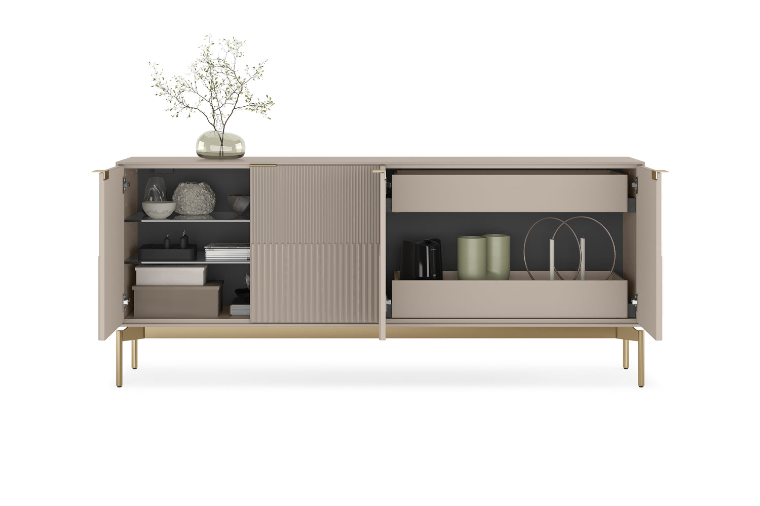 Zig makes a bold impression with its molded fluted doors and streamlined silhouette. Behind its rhythmic facade lies a flexible interior, ready to adapt to your storage needs.