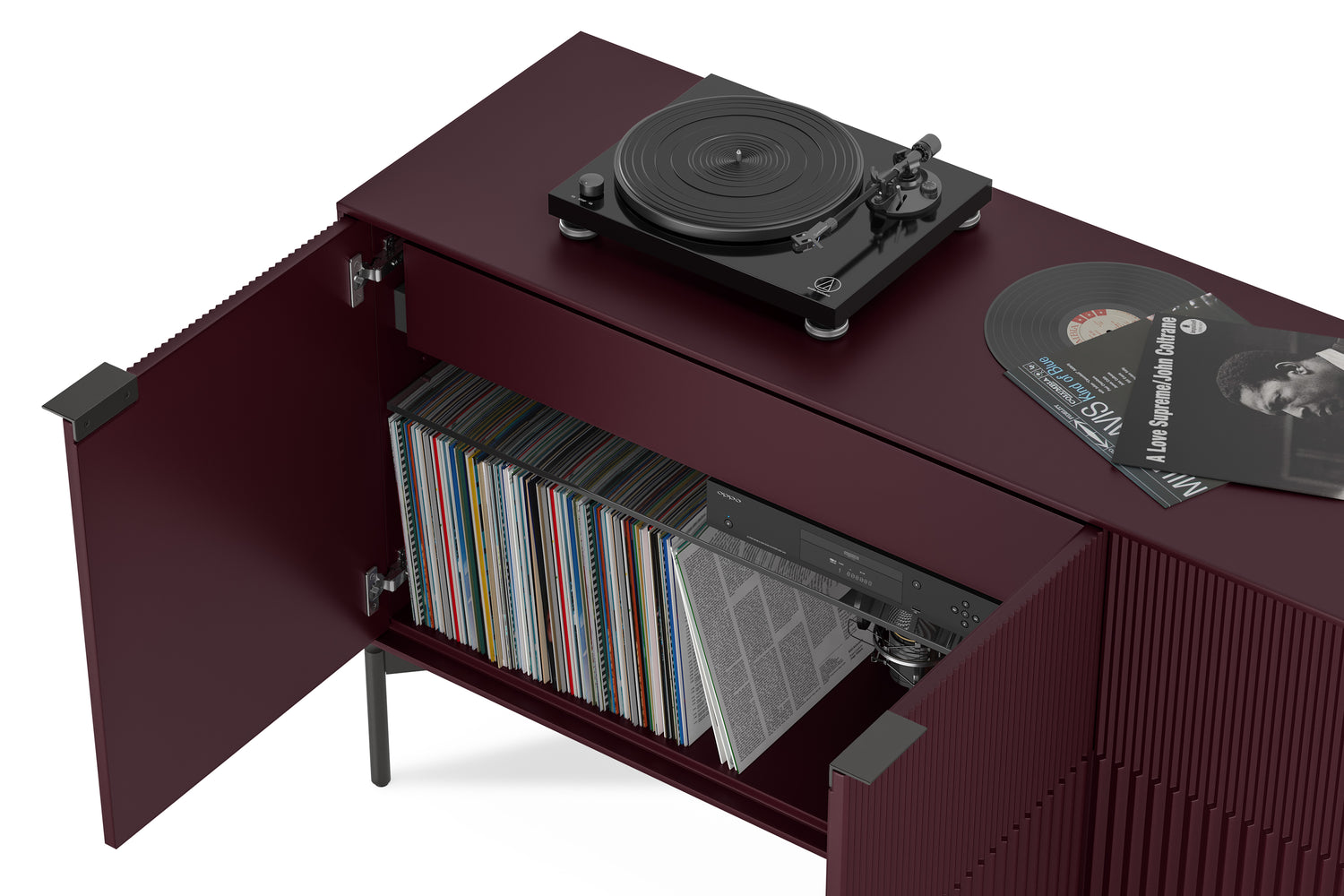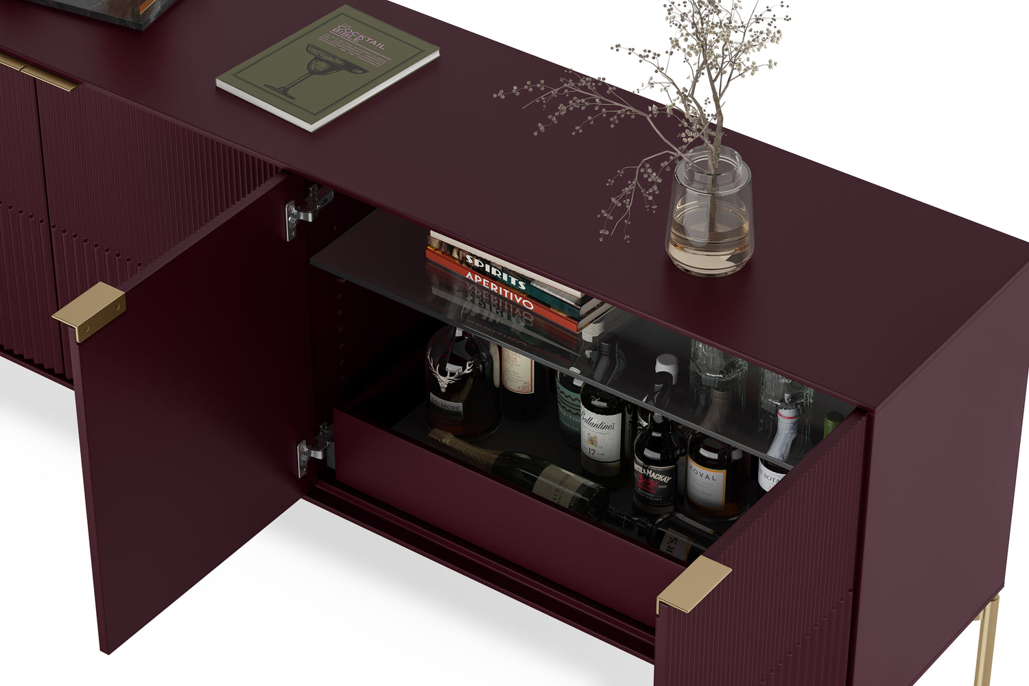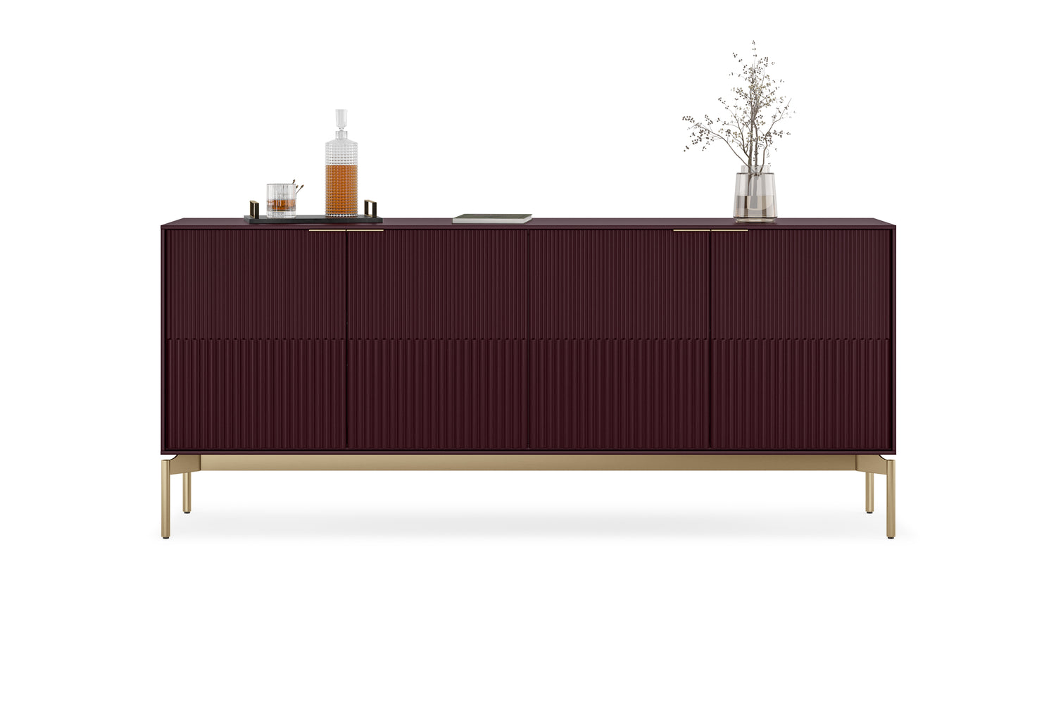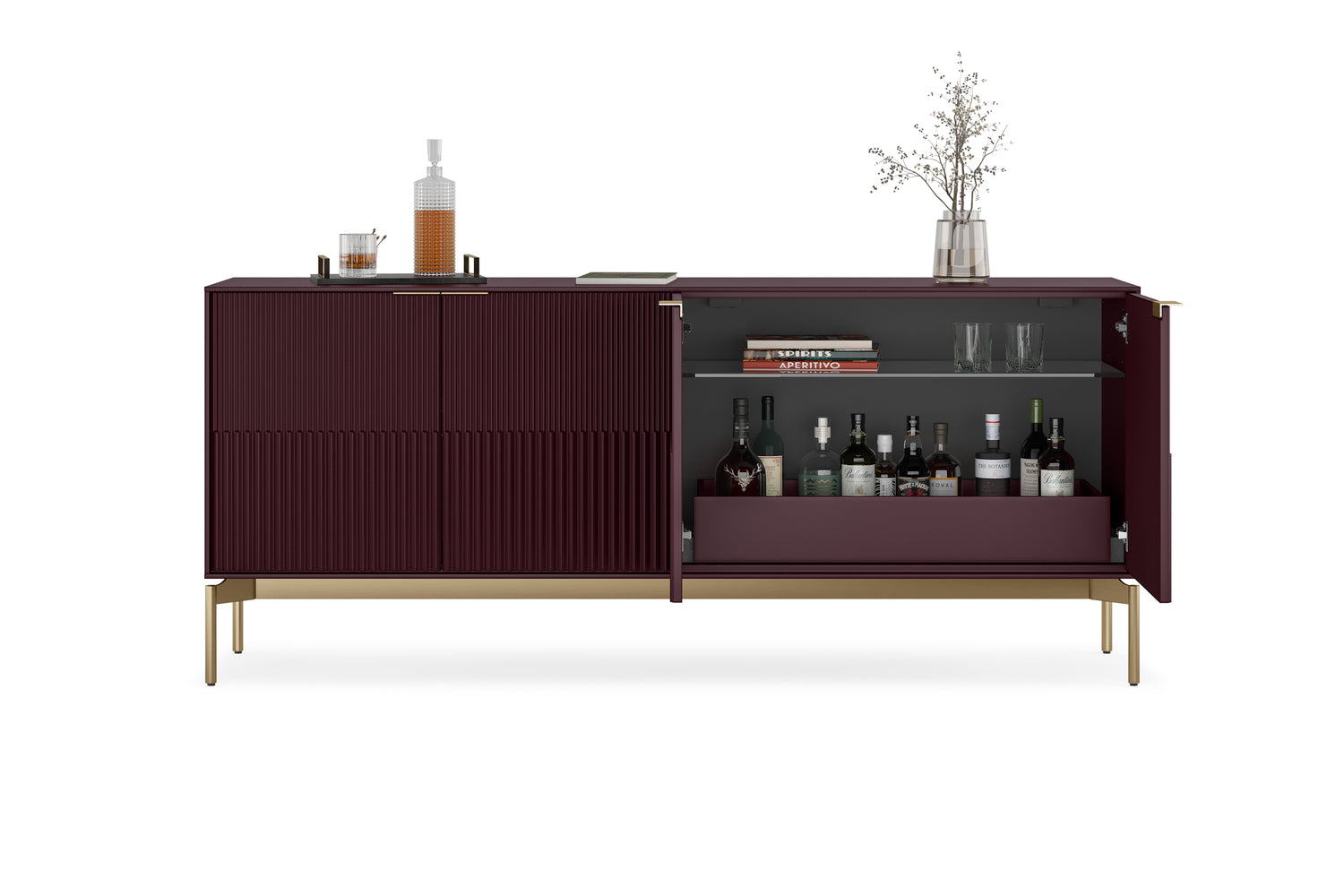 Seamlessly blending texture and versatility, Zig features adjustable shelves and two repositionable drawers, offering a customizable storage solution behind its striking fluted doors. Hidden wire management and soft-close doors add to its refined functionality.
