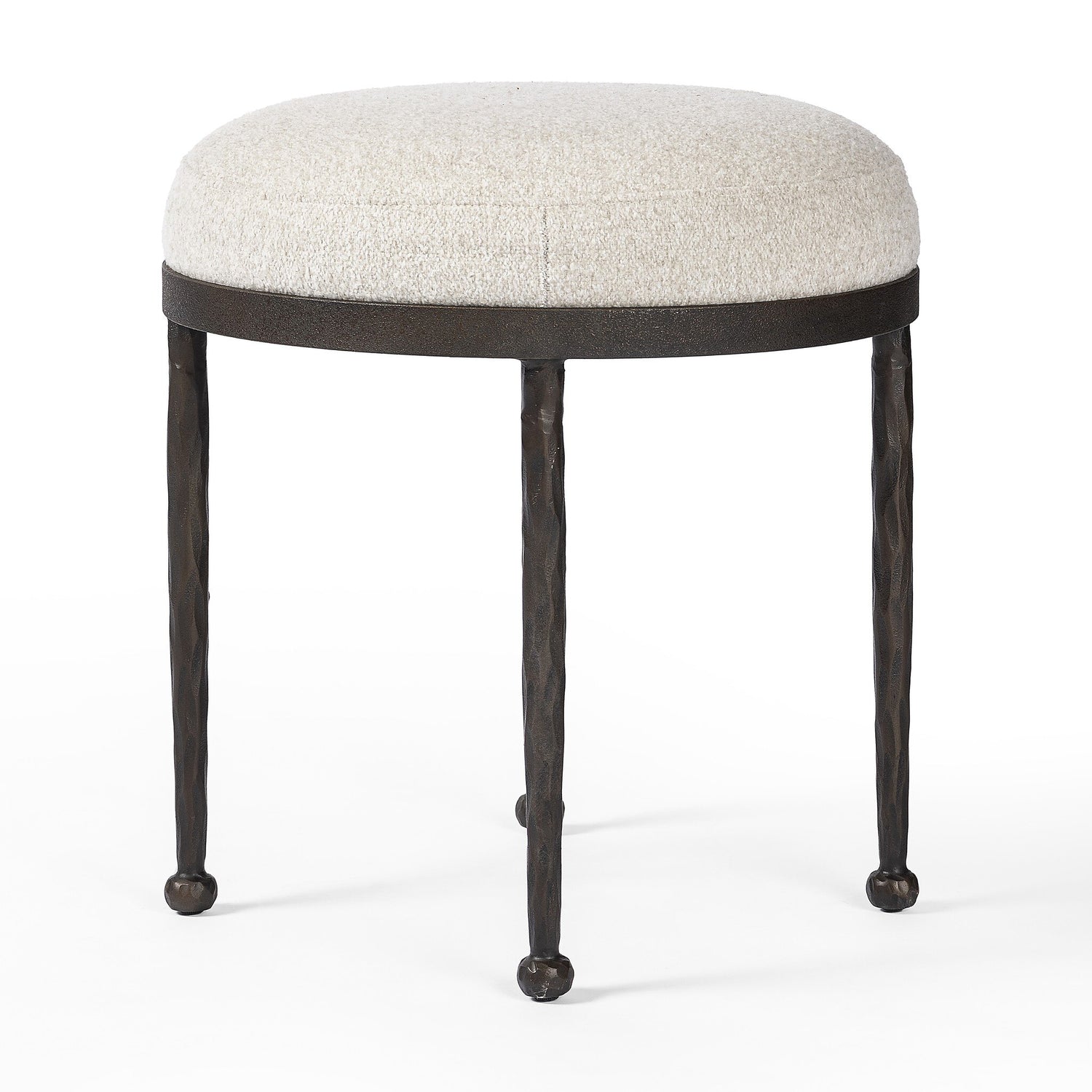 The Corinne Accent Stool by Four Hands delivers sculptural simplicity with inviting softness. This versatile piece doubles as a cocktail ottoman or extra seating, featuring a rounded seat upholstered in boucle-like performance fabric. S-spring construction ensures comfort, while the hammered bronze-finished iron legs introduce hand-forged character. Perfect for bedrooms, living spaces, or anywhere a refined, multi-functional accent is needed.