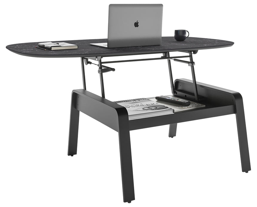 The Cloud 9 makes transitioning from work to play a dream. With a place for everything, the Cloud 9 shines in a supportive role through streamlined design, durable construction, and premium finishes. A lined lower storage compartment is accessible from the sofa side of the table when the top is closed, perfect for housing a laptop, remote controls, coasters, and more. Hydraulic supports provide a wide range of motion that extends the reach of the table, along with smooth operation during opening and closing. Finished with a durable porcelain top, the Cloud 9 is a beautiful and versatile coffee table well suited for everyday use and makes a unique addition to any living space. Nonslip lining helps to hold stored items in place, while a sturdy steel base and leveling feet provide stability on a variety of flooring.
