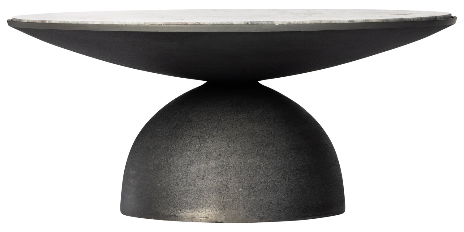 A sculptural play on shape. Hammered grey-finished aluminum base supports a grand, rounded tabletop of creamy taupe marble with beautiful natural veining.