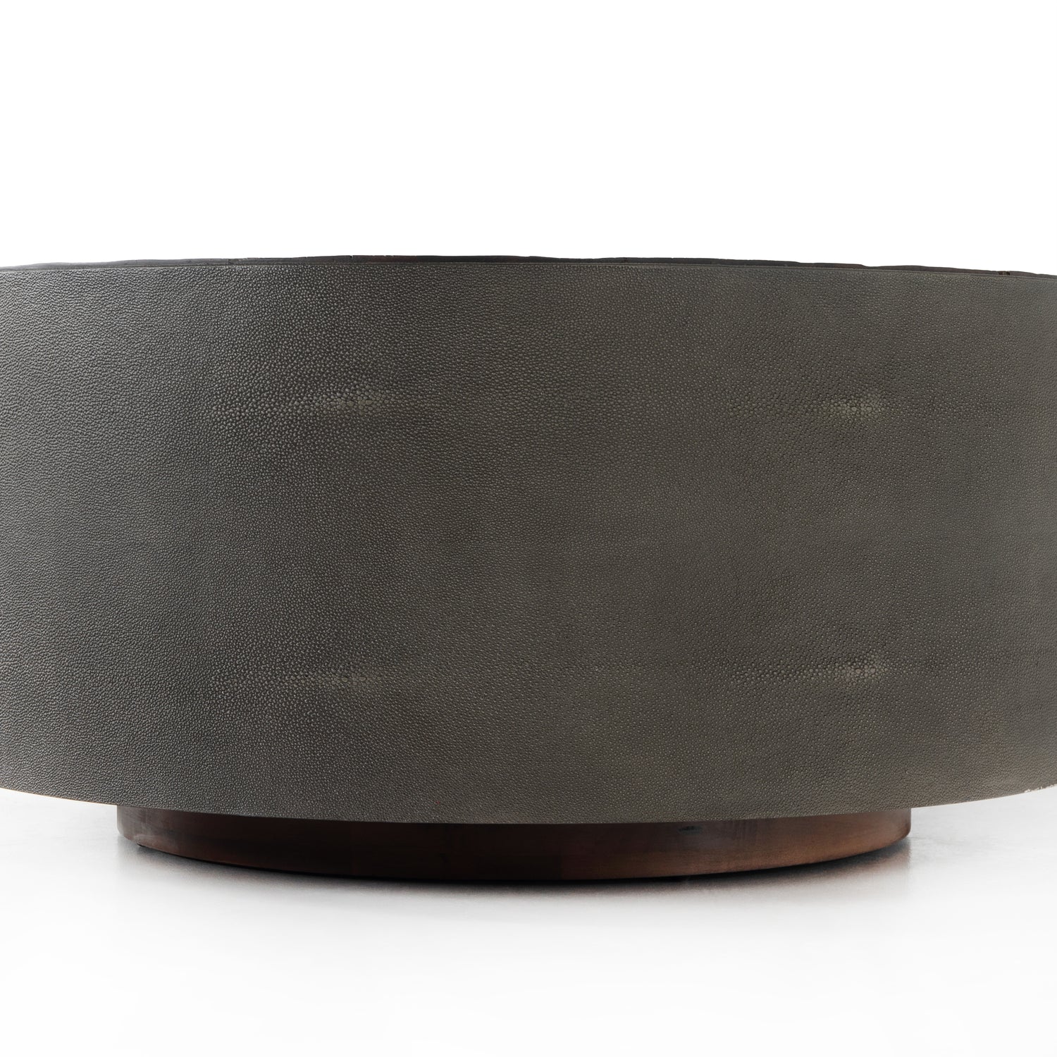 Crosby Round Coffee Table - Natural Peroba / Charcoal Faux Shagreen is backordered and will ship as soon as it is back in stock.