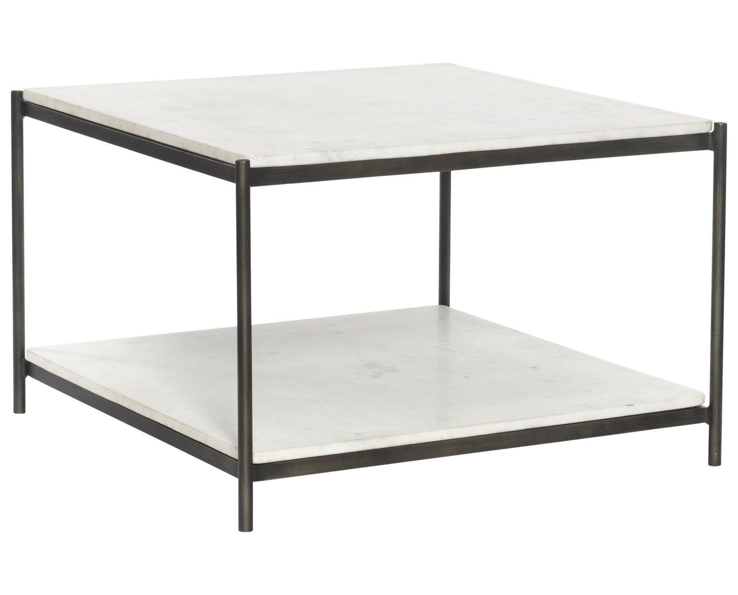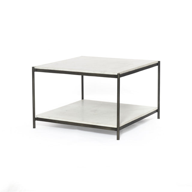 The Felix Bunching Table adds a pop of sophistication to any space. Polished white marble lays two tiers of smooth shelving for an open style with plenty of surface area. This table features a sophisticated hammered grey iron frame finish and casters for a feminine-industrial spin, and is perfect in pairs. The Felix Bunching Table is part of the Marlow collection.