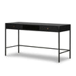 Sleek and streamlined with industrial influence, the Soto Desk lends a smart, understated edge to any workspace. Its black-finished iron frame supports a minimalist silhouette, while two drawers with bronze-finished hardware provide discreet storage. A central open cubby adds versatility, keeping everyday items conveniently within reach. Whether styled in a modern home office or used as a hallway console, this desk balances form and function with quiet confidence.
