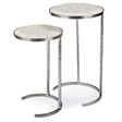 Fragments of bone are shaped into tiles and inlaid by hand to create the rich mosaic tops of our tables. Buffed to a high-gloss shine, their warm natural hues are set off by airy frames in polished nickel. When not holding cappuccino and truffles, the set of two nests compactly.