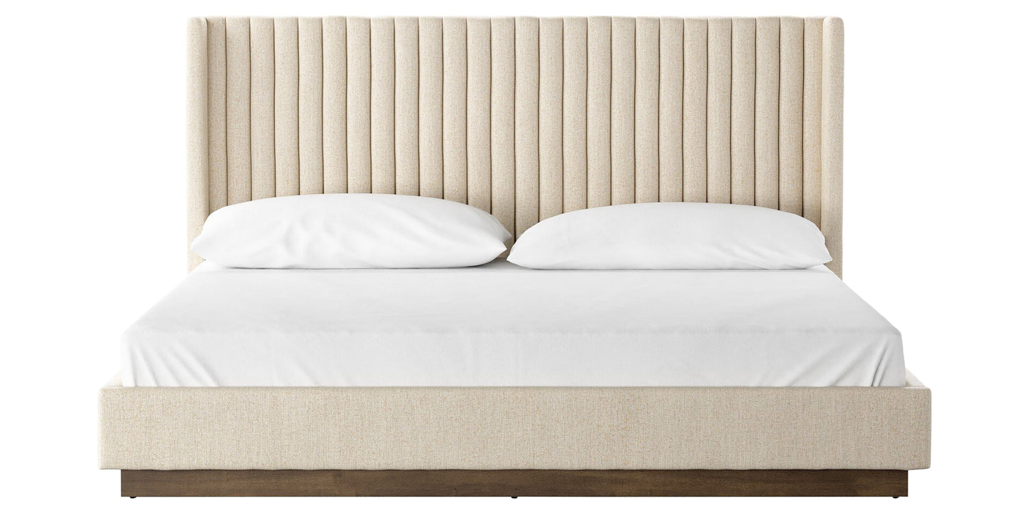 With its striking vertical-channel upholstery and tailored profile, the Four Hands Montgomery Bed brings elevated elegance to the bedroom. A solid parawood plinth base adds warmth and contrast, while the tall, structured headboard creates a dramatic focal point. Available in multiple finishes, this piece blends comfort and architecture with refined simplicity.