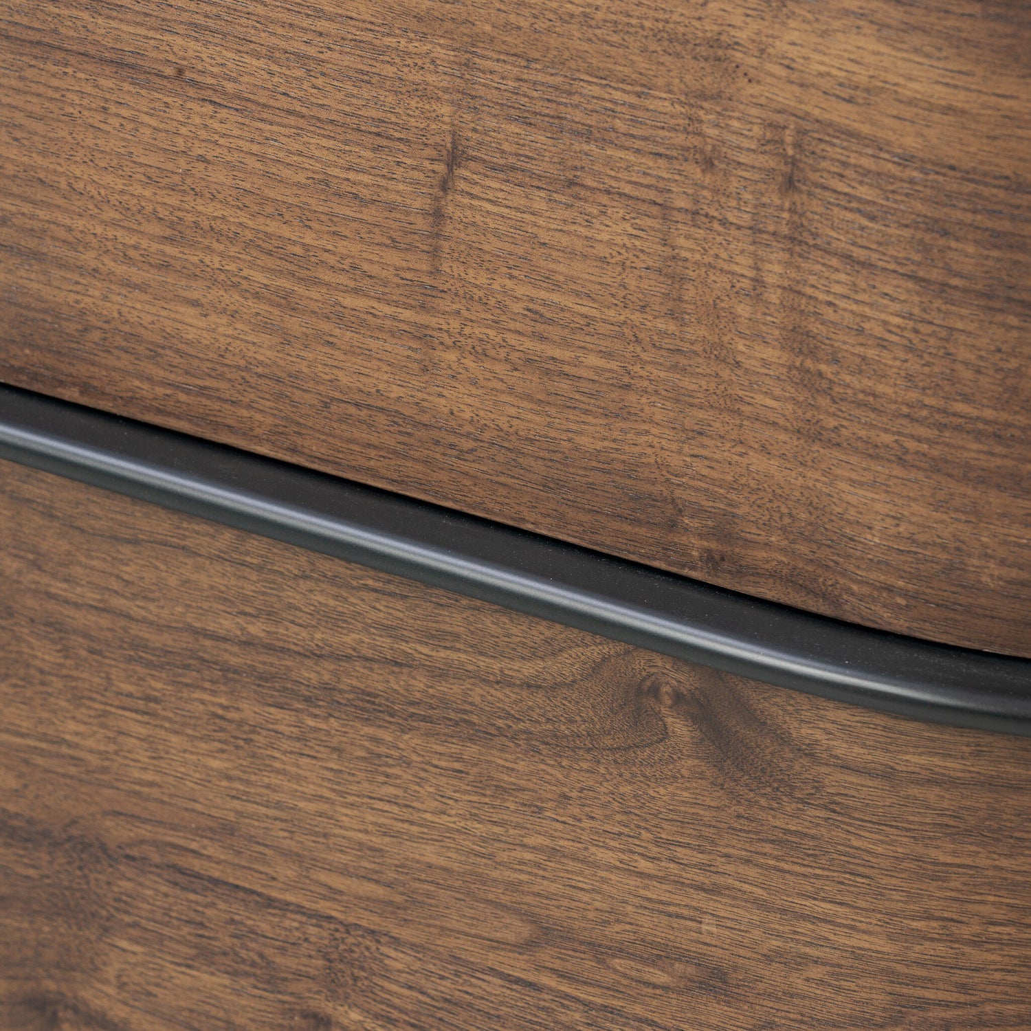 Dark brown walnut is aesthetically shaped with fluid, rounded corners on a ski leg base. The seamless design features four spacious drawers, two on each side, with metal bar hardware that runs along the tops of the drawers. A set of doors in the middle allow for larger items.