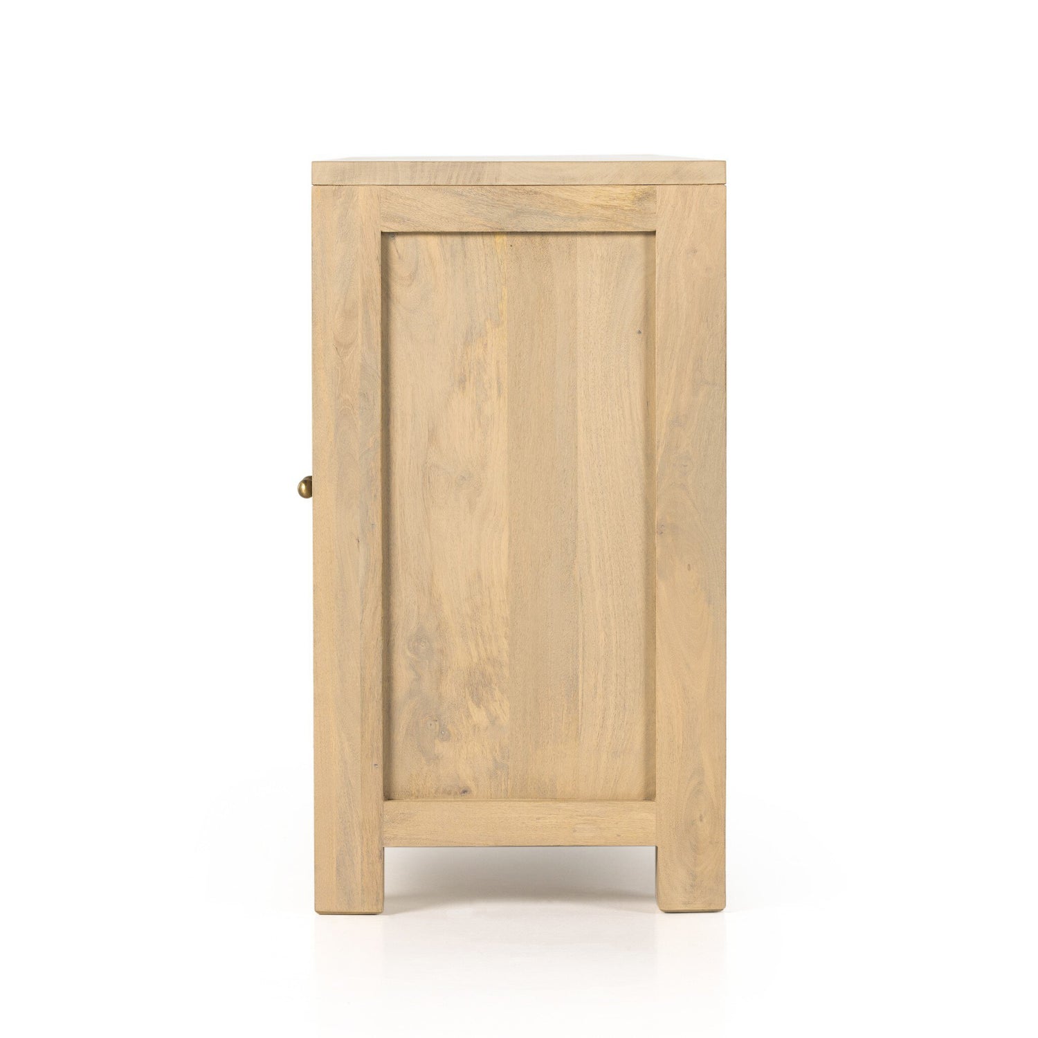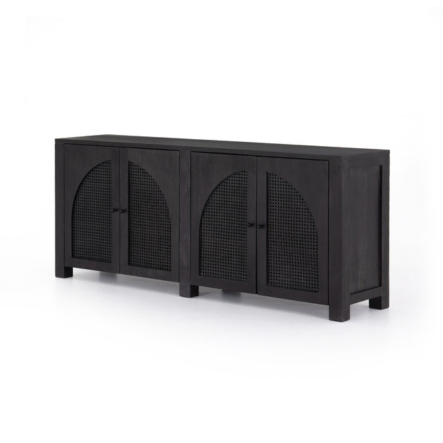 The Tilda Sideboard is grand in scale and presence. Black-washed or natural mango encases arched cane door panels featuring black-finished or satin brass iron hardware. This design showcases a forward-thinking material mix with monochromatic vibes. The Tilda Sideboard is part of the Leighton collection.