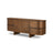 Dark brown walnut is aesthetically shaped with fluid, rounded corners on a ski leg base. The seamless design features four spacious drawers, two on each side, with metal bar hardware that runs along the tops of the drawers. A set of doors in the middle allow for larger items.