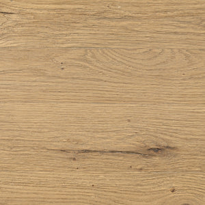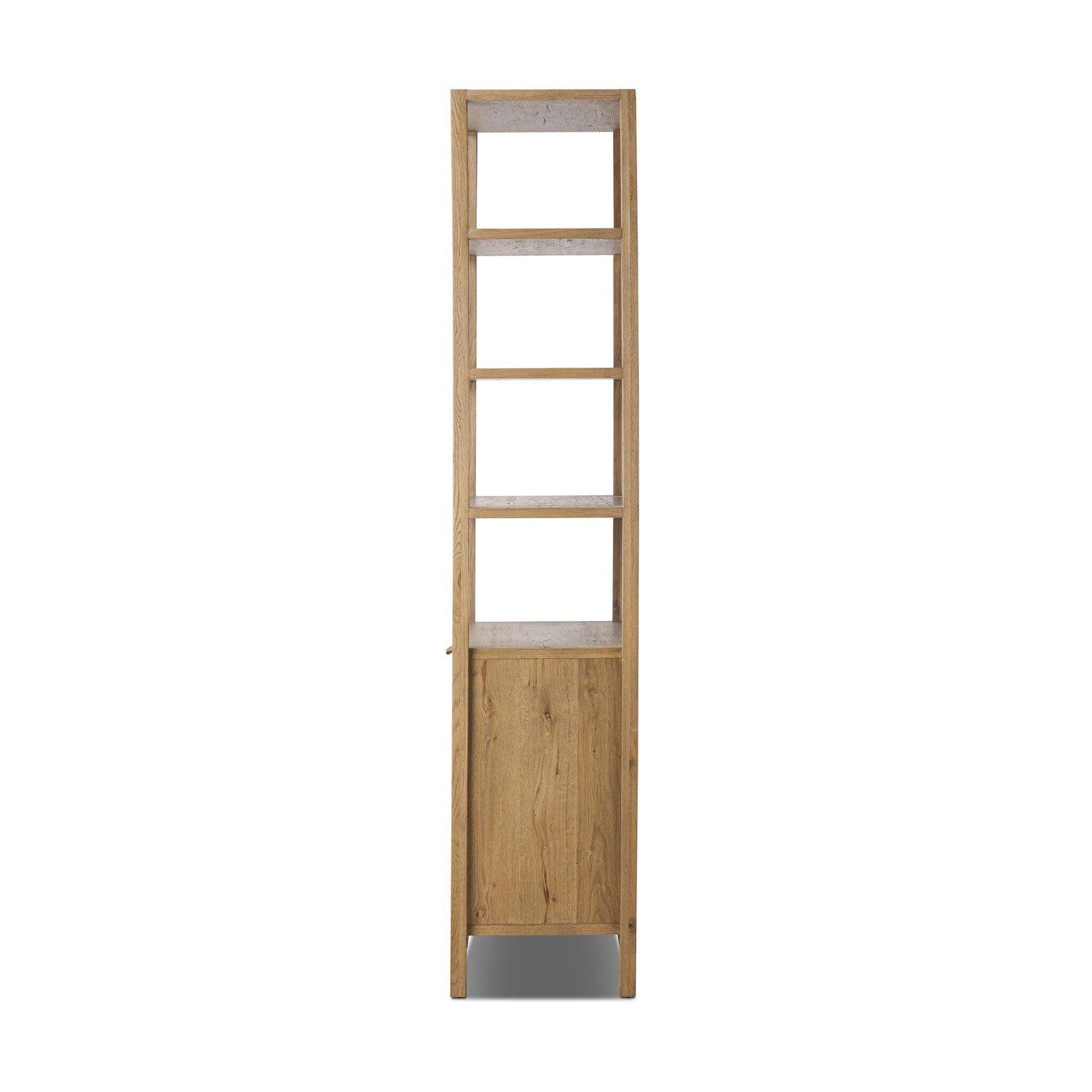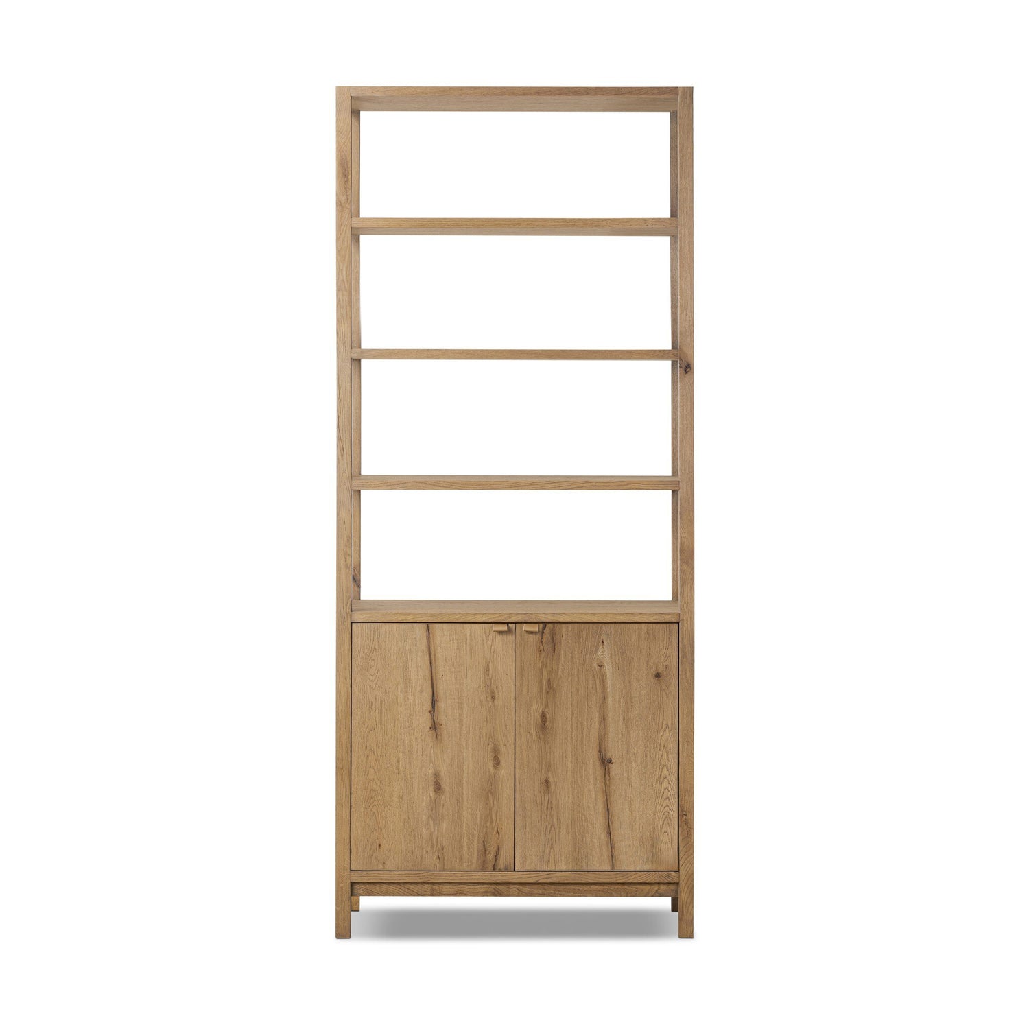 A beautifully simple piece crafted of light, worn oak features clean Parsons-style legs and plenty of storage and display for favorite books and treasures.