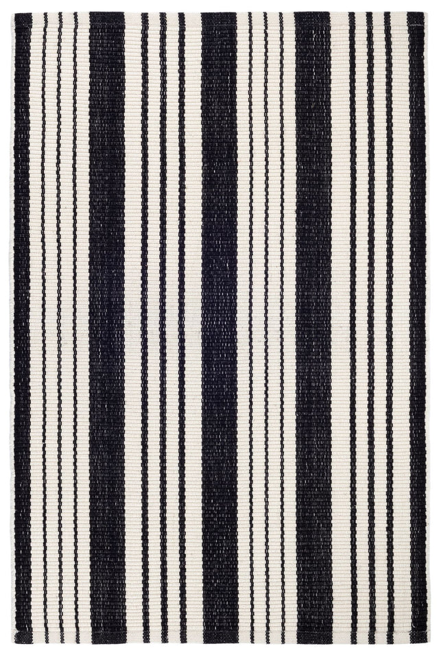 Get the best of both worlds with this durable, washable, and eco-friendly indoor/outdoor rug in a classic black and ivory stripe. Blends beautifully into both traditional and modern spaces.