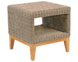 A perfect companion to lounge seating, the Frances Side Table brings refined texture and functionality to outdoor living spaces. Crafted from all-weather wicker over a sturdy Grade A teak base, it is finished with a clear tempered glass top for effortless style and durability. Its clean lines and open shelf offer both storage and visual lightness, complementing any configuration of the Frances Collection.