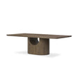 Beautifully heavy oak shape shifts. Finished in a moody brown, a streamlined rectangular top contrasts a heavy capsule base with a hollow arch for a light and airy design element.
