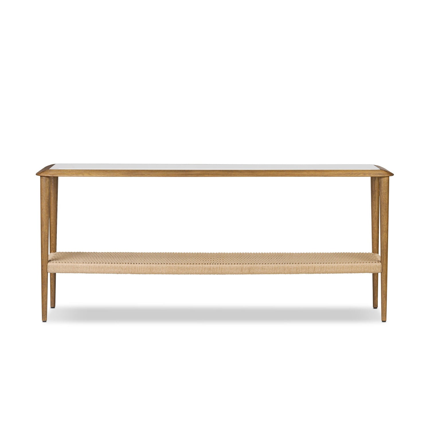 Made from brown oak, woven paper cord and tempered glass, an open-style console works into any space or style with ease, thanks to its beautifully versatile design.
