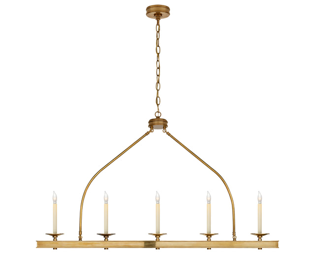 The crisp silhouette features five candle-style sockets mounted along a sleek rectangular bar, suspended from elegant arched supports and finished in hand-applied tones. Measuring over 53 inches in width, the Launceton’s generous proportions make it ideal for anchoring large-scale settings with poise and polish.