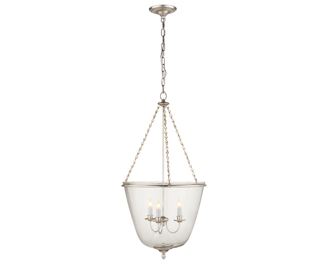 The Pondview Medium Jar Lantern by Visual Comfort brings sculptural clarity to traditional lighting. Designed by AERIN, its bell-shaped glass shade surrounds a suspended three-light candelabra, offering a warm, even glow without visual weight. Decorative chain detailing and clean metalwork strike a balance between classic character and understated elegance.