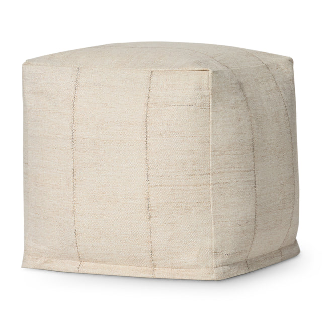 This striped, natural-toned pouf adds an understated pattern to living spaces and can be used as an ottoman or extra seating. The pouf measures 18"W x 18"D x 18"H and is made of polyester and cotton.