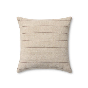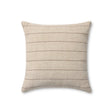 Keisha is a striped throw pillow from Amber Lewis x Loloi with a heathered beige and brown color palette, a versatile design for a range of home decor styles, from traditional to organic modern. The pillow cover is woven of jute and cotton in India and measures 18” x 18”, a versatile size for living rooms and bedrooms.