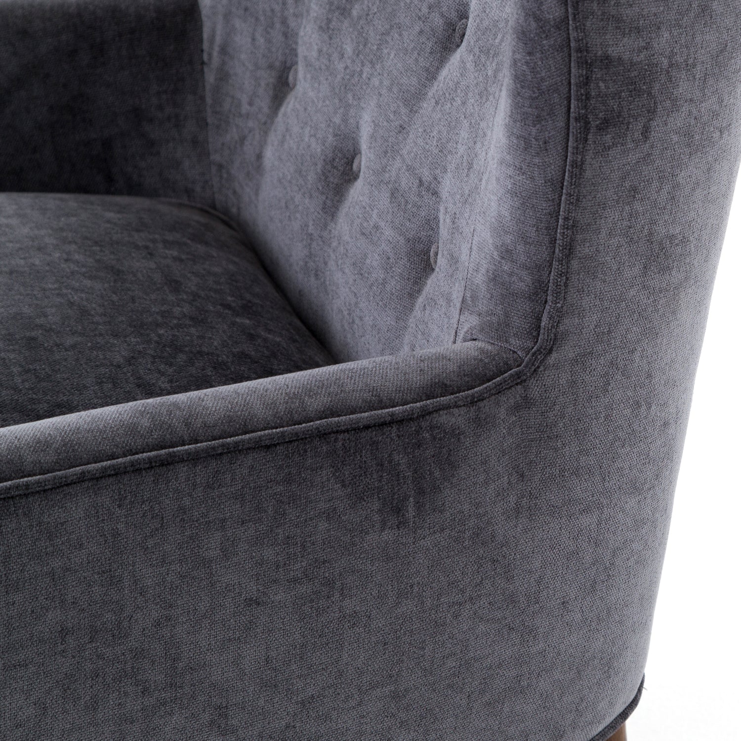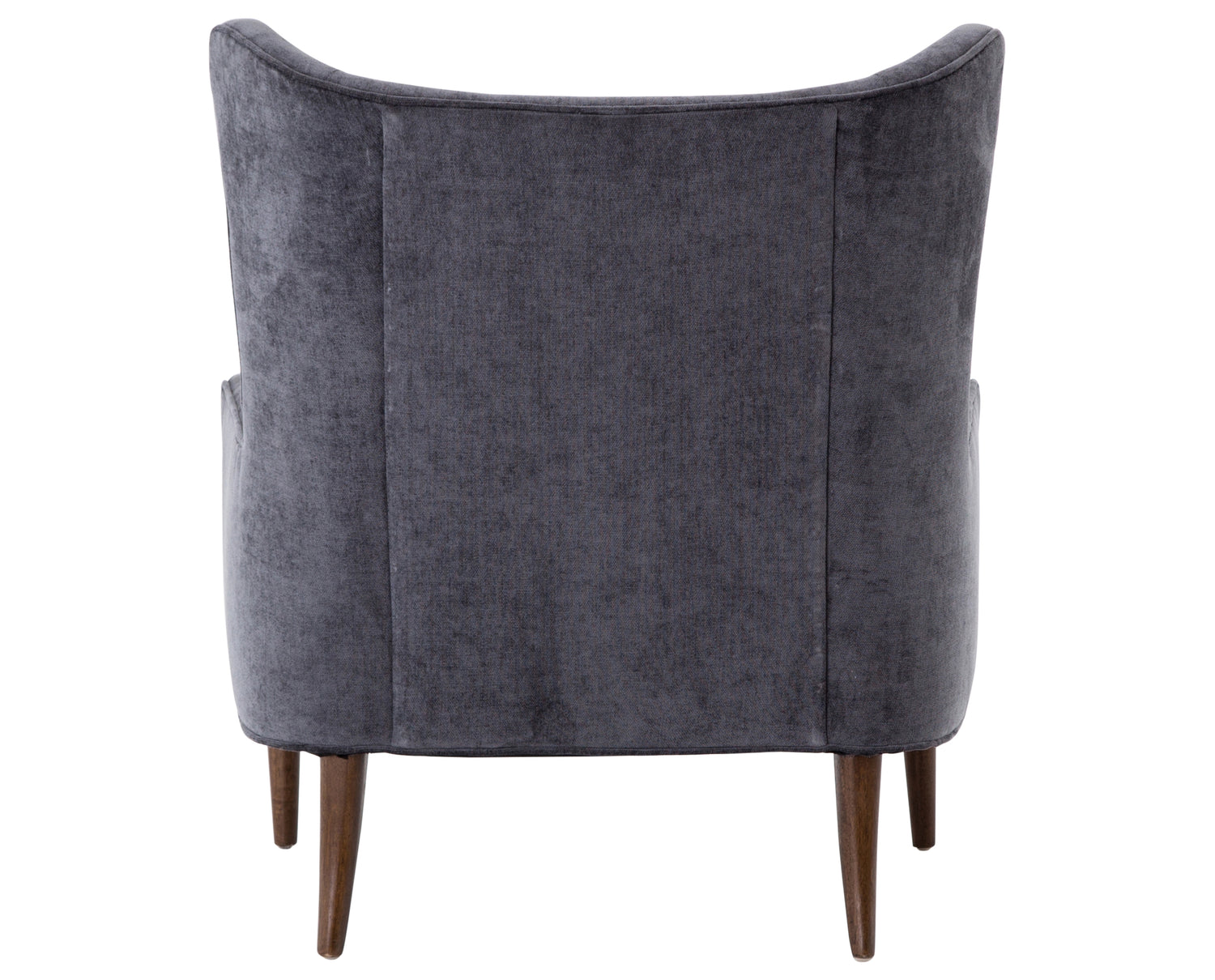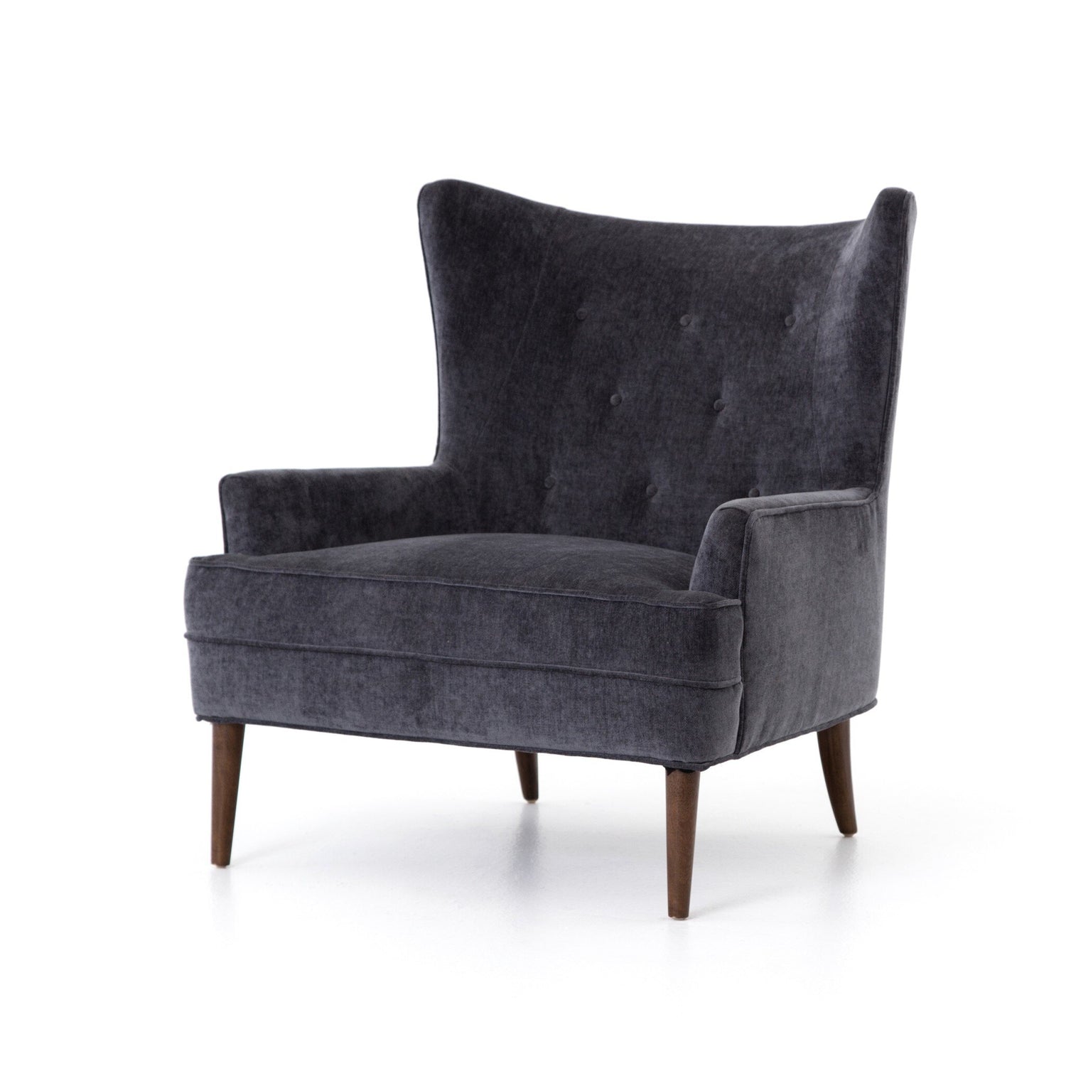 The Clermont Chair presents an elegant, mid-century twist on the traditional wing chair. Featuring hand-button tufting, accent seaming, and sophisticated charcoal grey upholstery. The Clermont Chair is part of the Kensington collection.