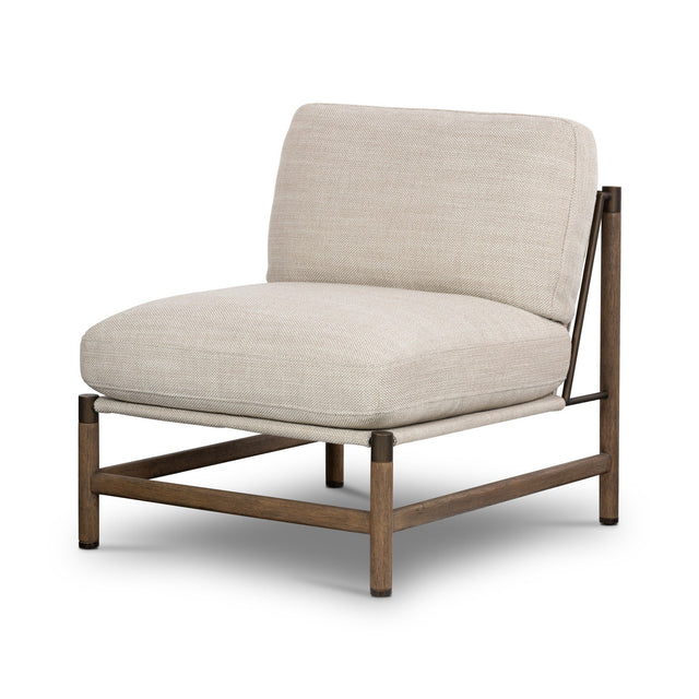 Seamlessly well-tailored. Framed by distressed parawood with bronzed steel caps, this laid-back armless seating style is upholstered in a taupe performance-grade fabric exclusive to Four Hands.
