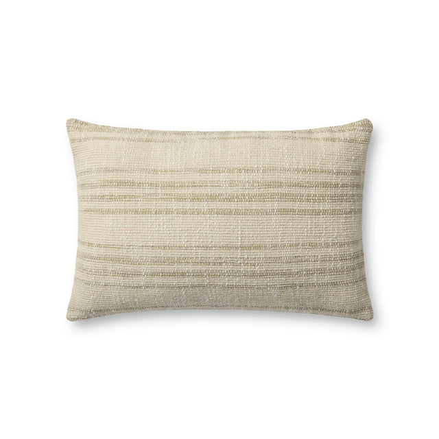 This throw pillow from Brigette Romanek x Loloi features neutral beige stripes with a classic rug-like texture woven of wool and cotton. The front pillow cover is 68% wool and 32% cotton and measures 13” x 21”, an elongated size to style in living rooms and bedrooms.