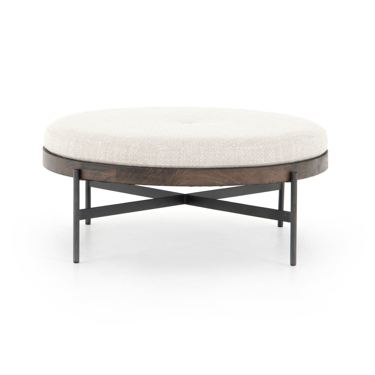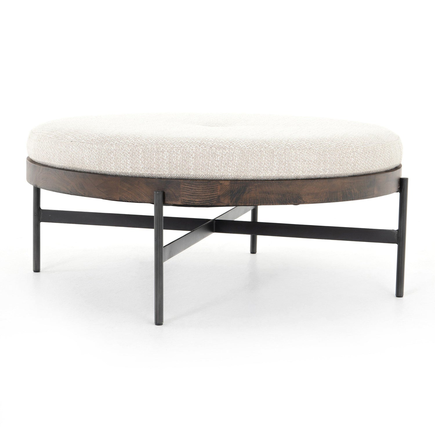 The Edwyn Large Ottoman is all about stylish versatility. An airy base of gunmetal-finished iron supports rounded beech wood with textural wheat upholstery. This piece is perfectly scaled to create additional seating or an extra surface when topped with a tray. The Edwyn Large Ottoman is part of the Townsend collection.