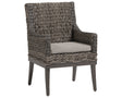 The Ratana Boston Dining Arm Chair combines transitional elegance with exceptional comfort for outdoor dining. Expertly handwoven in thick, braided Smoke Grey resin weave over a powder coated Ash Grey aluminum frame, it blends organic texture with all-weather durability. The plush seat cushion, upholstered in Sunbrella® performance fabric, delivers lasting comfort while resisting fading, moisture, and everyday wear. Integrated armrests provide additional support, making this chair ideal for extended dining and entertaining.