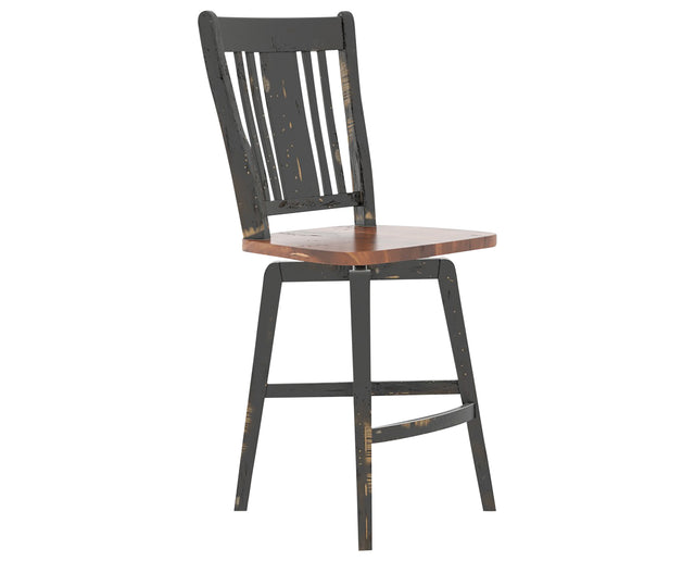 This stool is handmade by Canadian artisans, featuring solid wood construction with a distressed finish and timeless vertical slat back. Customize the Lloyd to suit your style and home.
