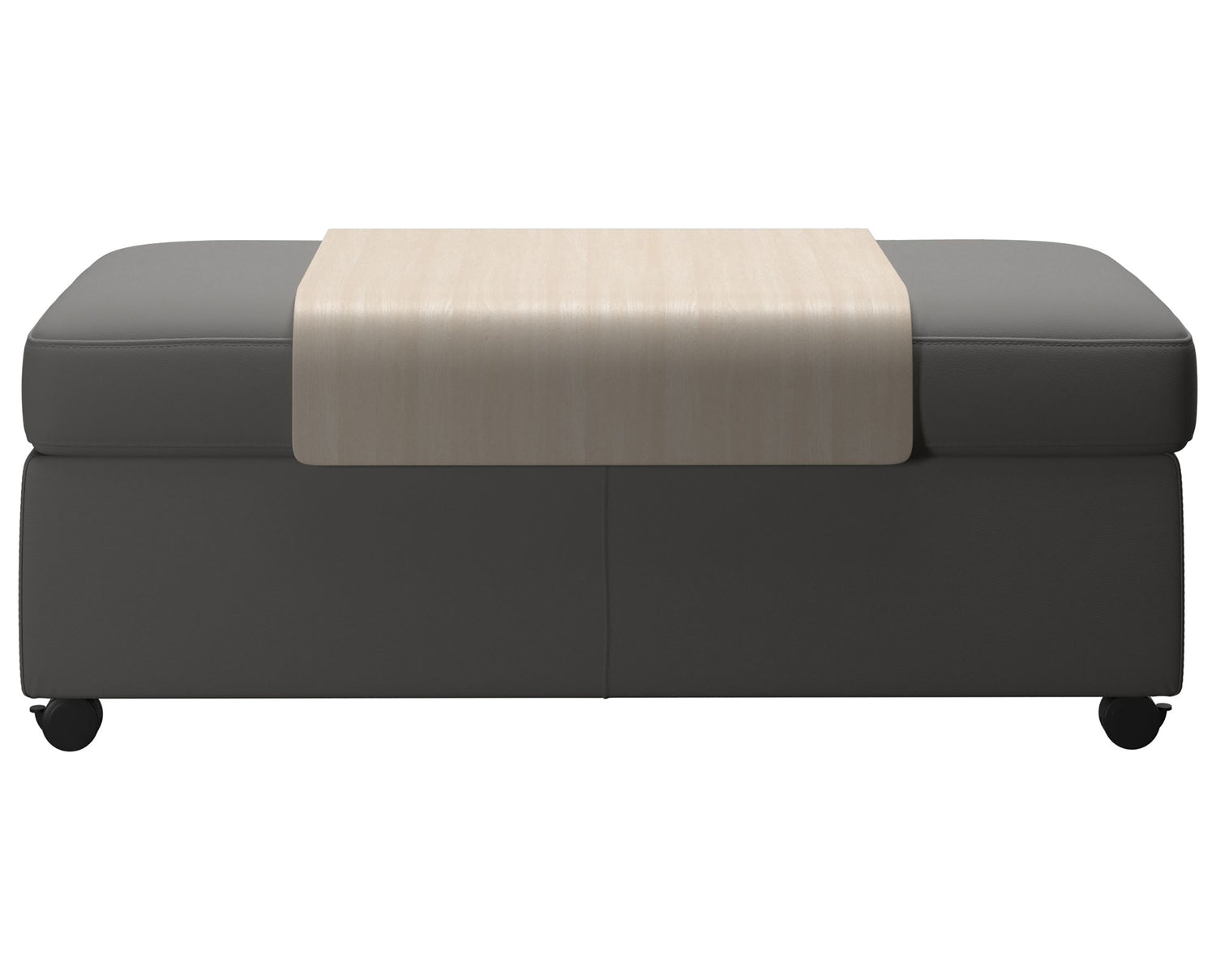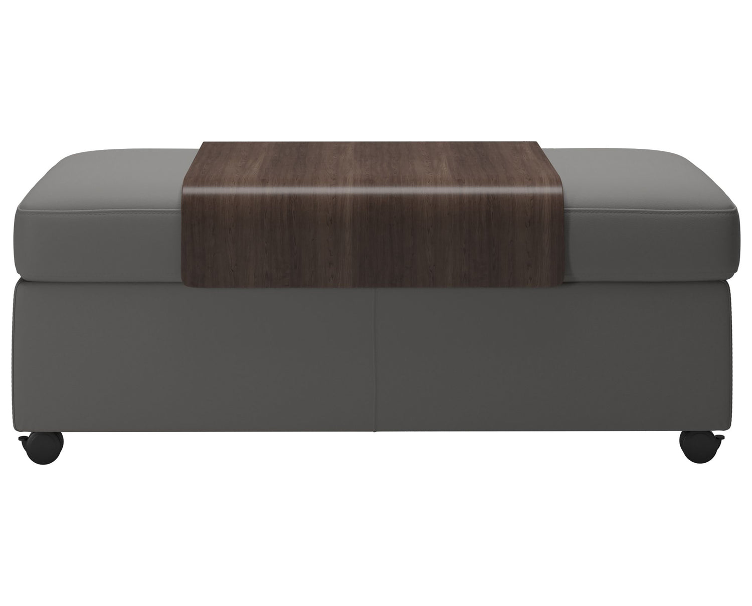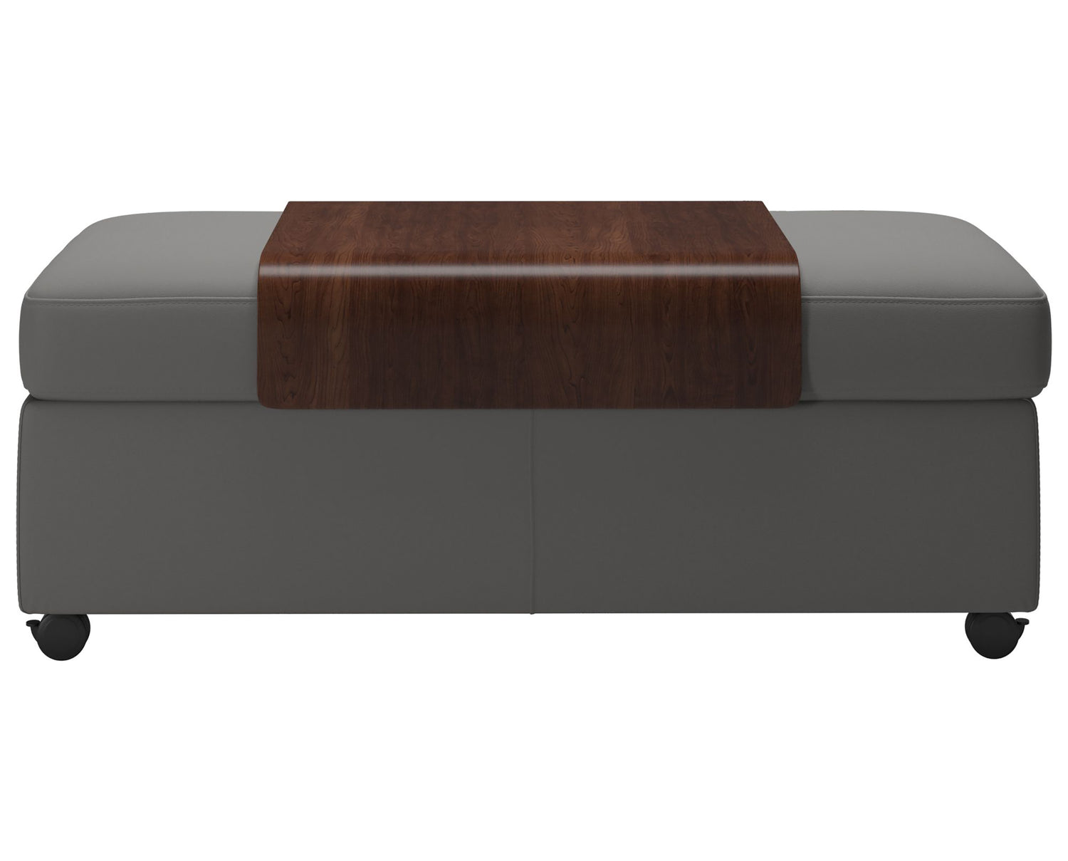 The Stressless Double Ottoman with Table offers great comfort with plenty of leg room for two, plus ample storage space inside. This ottoman includes a removable table top that fits snugly over the ottoman, creating a convenient and space-saving refreshment table when needed.