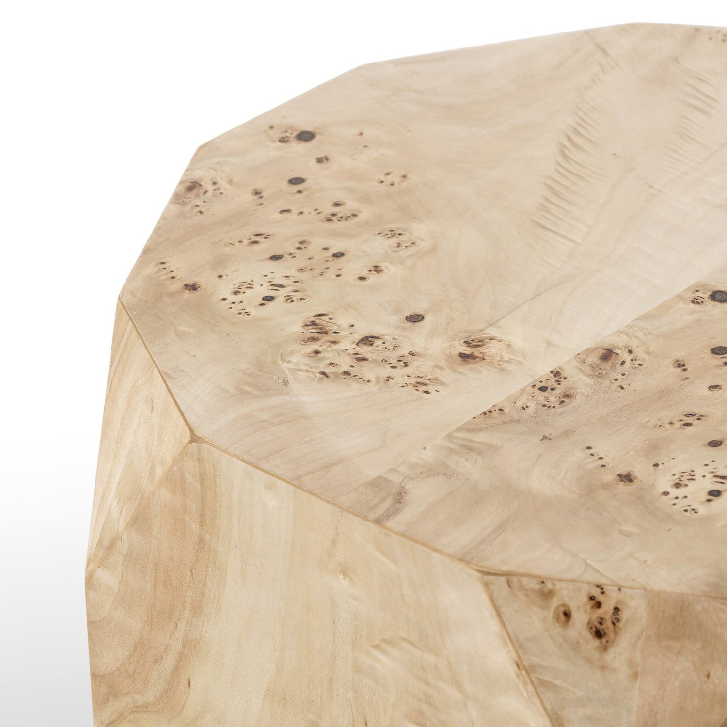 The Elena End Table brings organic character and a bold geometric profile to any living space. Crafted from light-finished poplar burl, each faceted panel reveals intricate natural graining and variation. A plinth-style base adds visual stability and grounds the design. Whether styled solo or in pairs, this sculptural form adds material interest and depth.