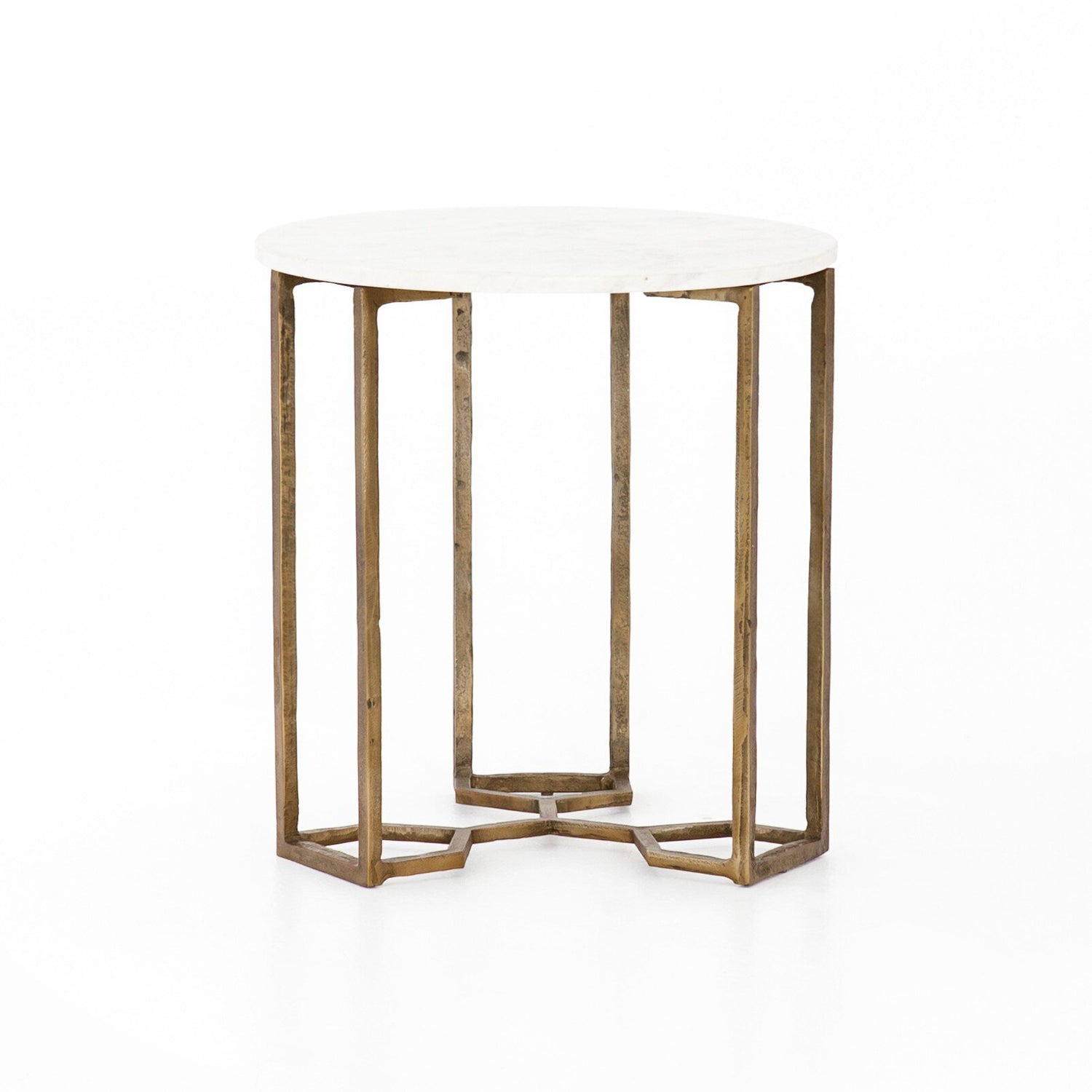 A graceful twist on geometric-inspired design. An aluminum base of raw brass forms pentagons to support a rounded top of polished white marble. An open-air look lends lightness to heavy materials.