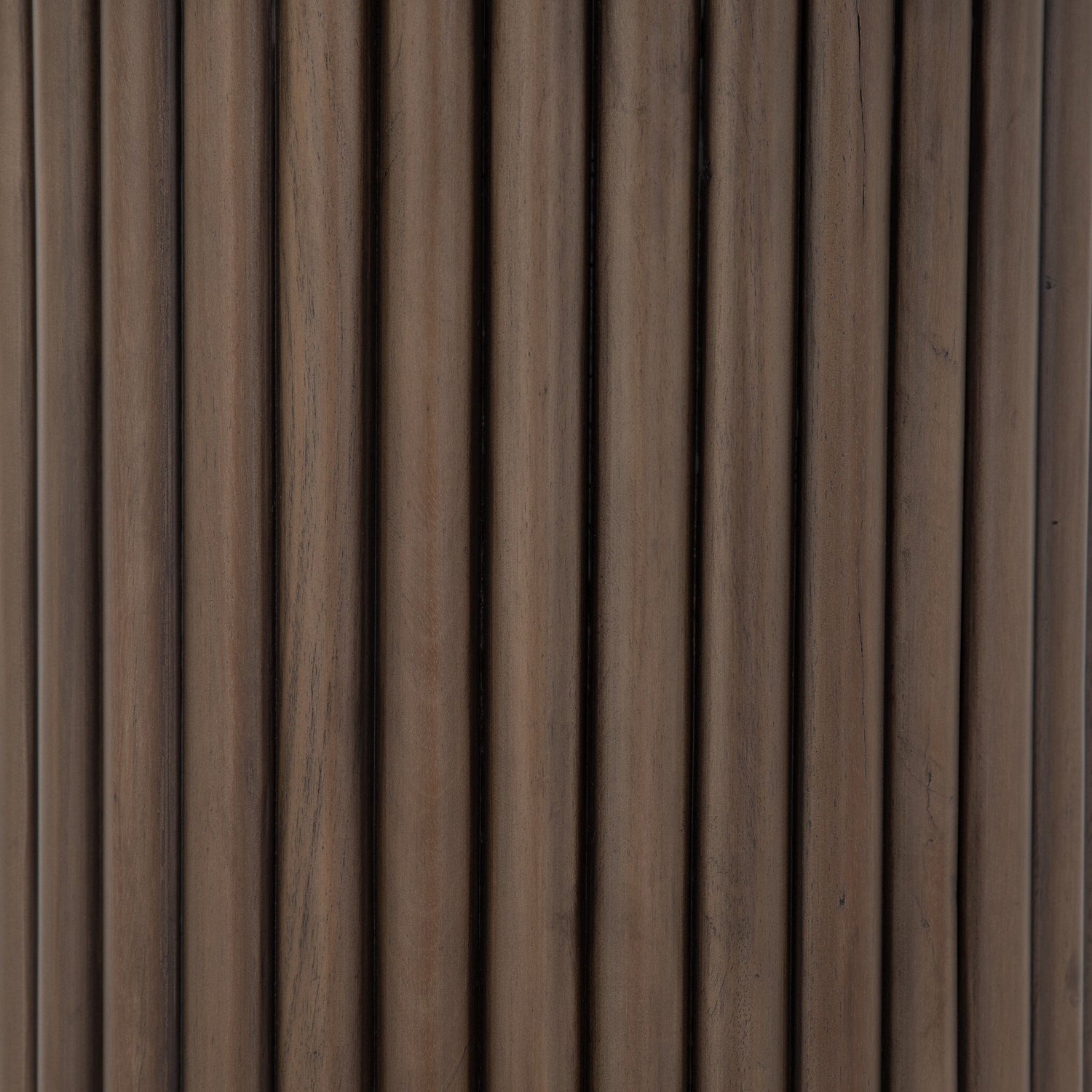 Inspired by decor in the majestic palaces of Jaipur, a conversation-starting end table is made from mixed reclaimed woods, with a rounded top and base with vertical reeding.