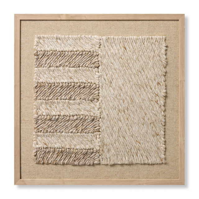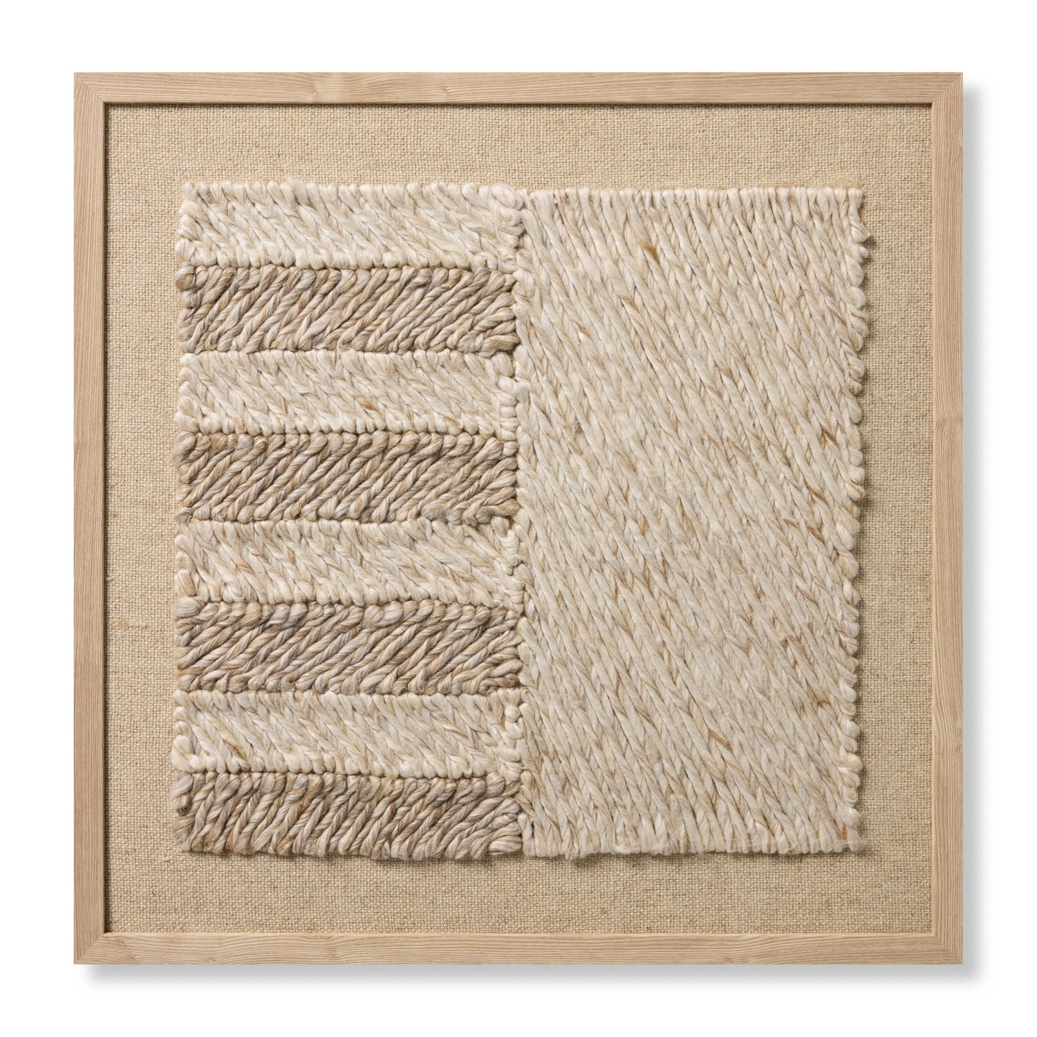 Bandera wall art features a natural-toned square textile with a tonal broken stripe pattern, a beautifully textured complement to many home decor styles, from organic to traditional. The neutral artwork is made in India of wool and custom framed by Loloi in the USA, measuring 32” x 32”.