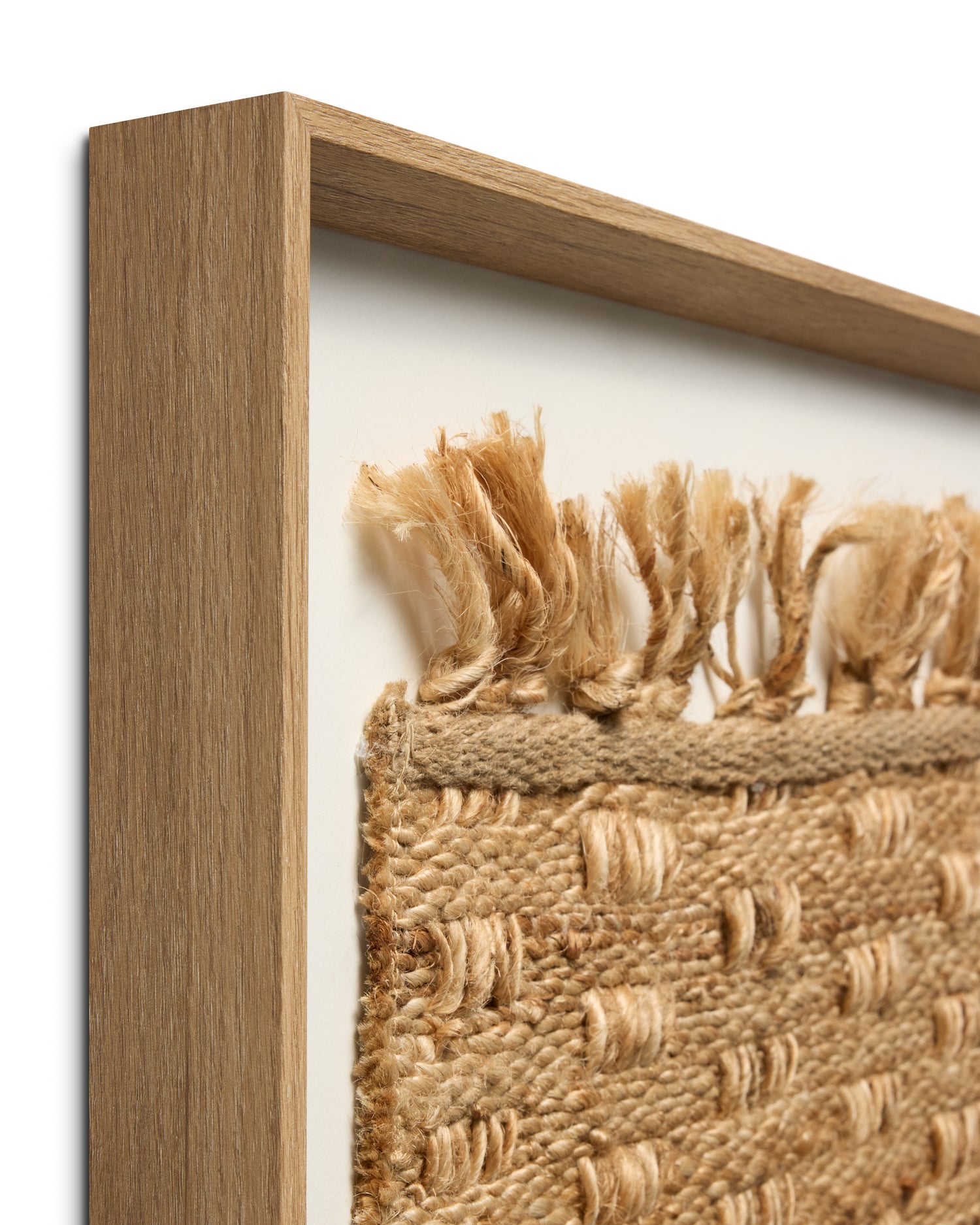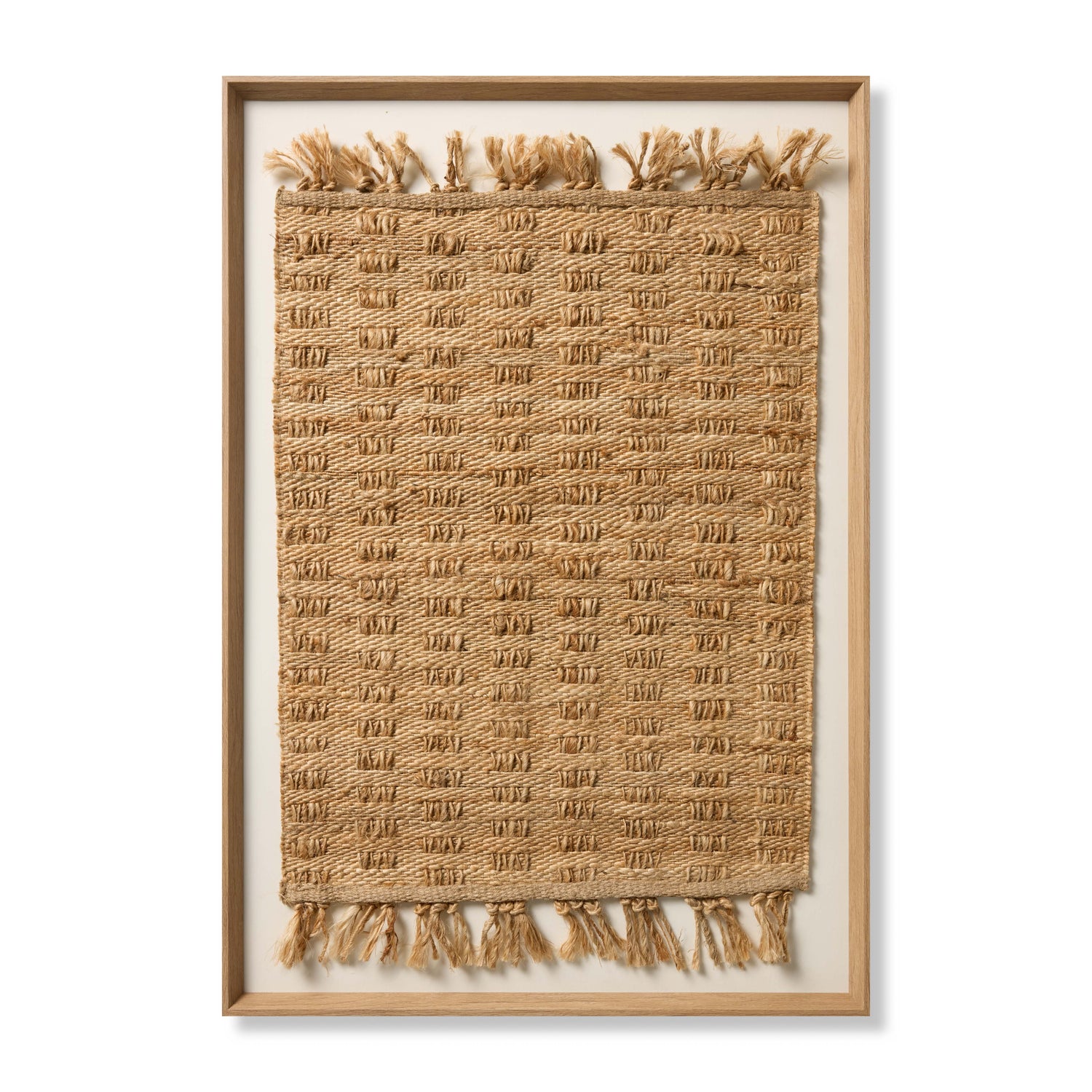 Churni large wall art by Loloi features a fringed jute textile with a raised gridded design, a strikingly textural piece for many home decor styles, from organic to farmhouse. The artwork is made in India and custom framed by Loloi in the USA, measuring 48” x 34”.