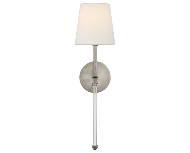 The Camille Sconce brings a refined aesthetic to interior walls and hallways, with an exaggerated crystal rod making a bold style statement. This fixture's archetypal torch shape is defined by its natural paper drum shade which, once lit, provides a soft glowing light that fills the space. A sleek metal holder mounts by a round wall plate, while the crystal extension refracts the warm glowing lights from above. The Camille Sconce is the picturesque beauty that takes your interior to a whole new level. The Camille Sconce is part of the Suzanne Kasler collection.