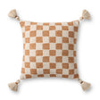 Amos is a rust and white checkerboard patterned throw pillow with corner tassels for a mix of elegance and playfulness, designed by Magnolia Home by Joanna Gaines x Loloi. This decorative pillow is woven of cotton and polyester in India and measures 18” x 18”, a versatile size for living rooms, bedrooms, and more.