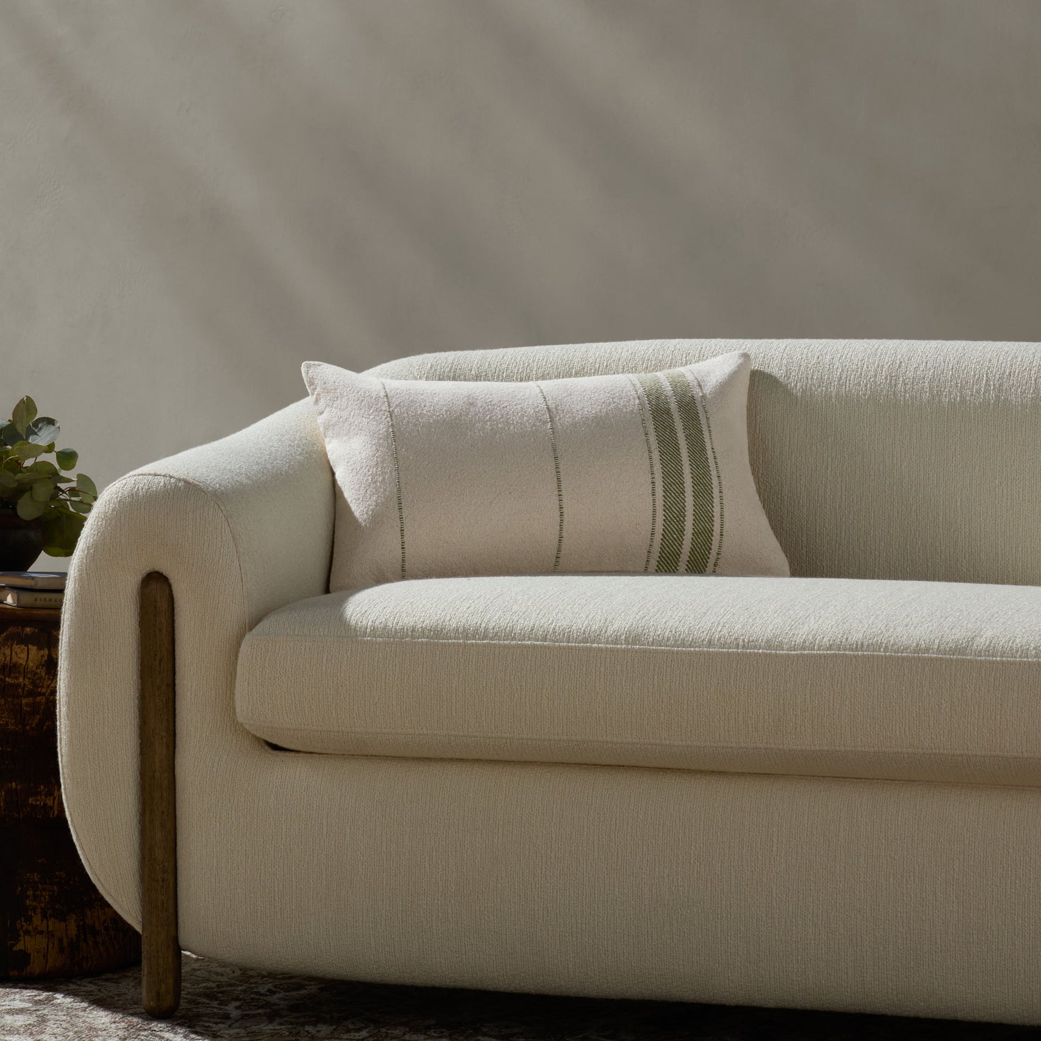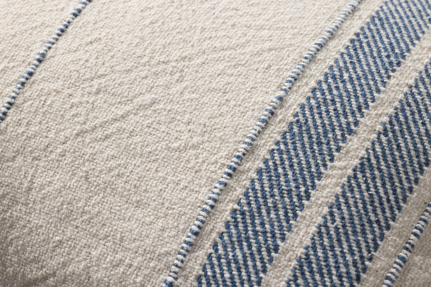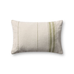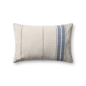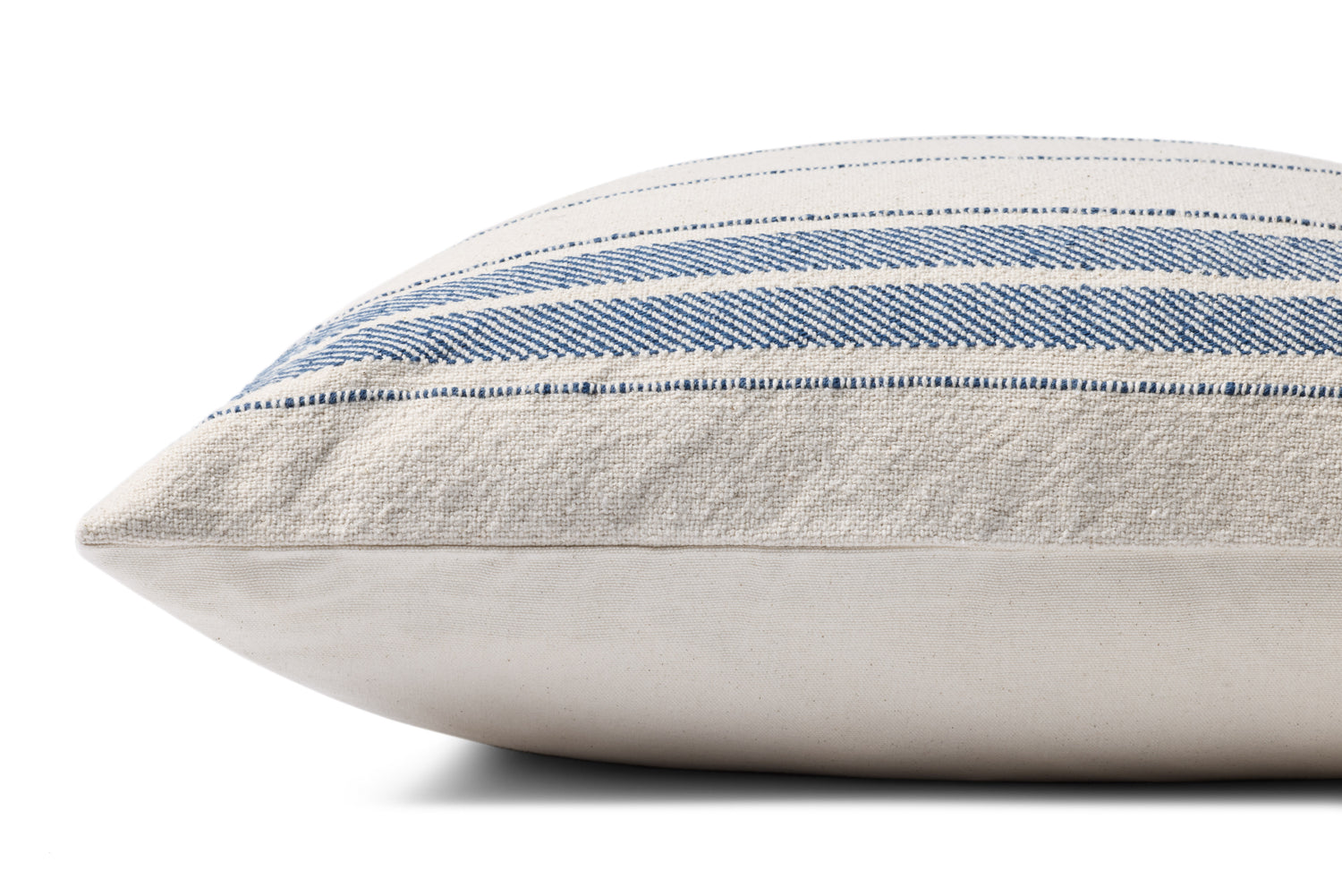 The Selena throw pillow from Magnolia Home by Joanna Gaines x Loloi features against a natural beige background, reminiscent of vintage flour sacks. The pillow cover is hand-woven of 100% cotton in India and is a versatile size for living rooms and bedrooms of all home decor styles.