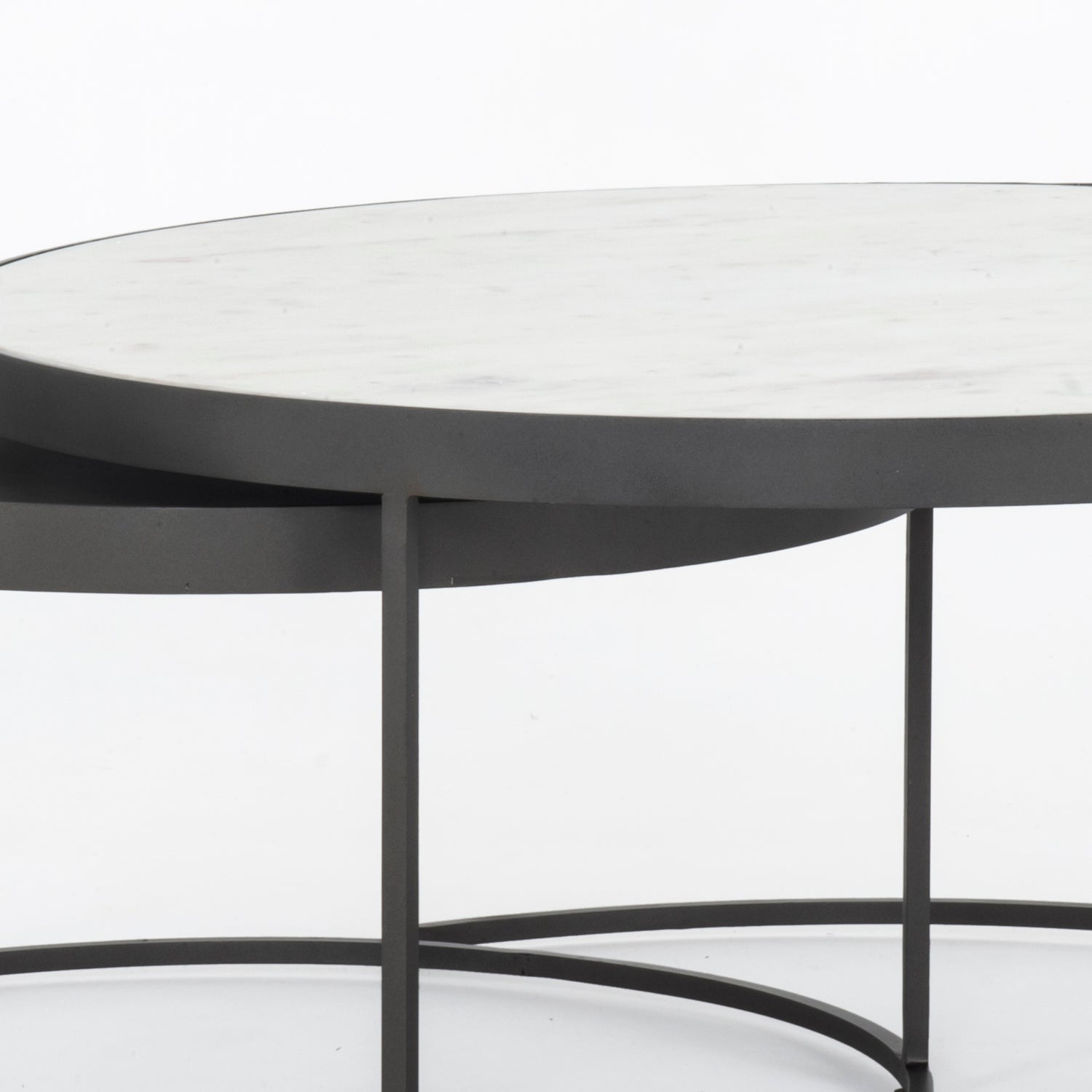 The Evelyn Round Nesting Coffee Table is stacked and structured, with slim iron lending edge to the sophistication of polished white marble. Nesting feature for compact functionality and modern, adaptable appeal. The Evelyn Round Nesting Coffee Table is part of the Rockwell collection.